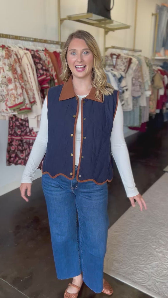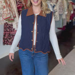 Introducing our Navy & Suede Vest - the perfect layering piece for fall and winter seasons! Perfect for layering and adding an a trendy piece to your outfit! Functional and stylish!