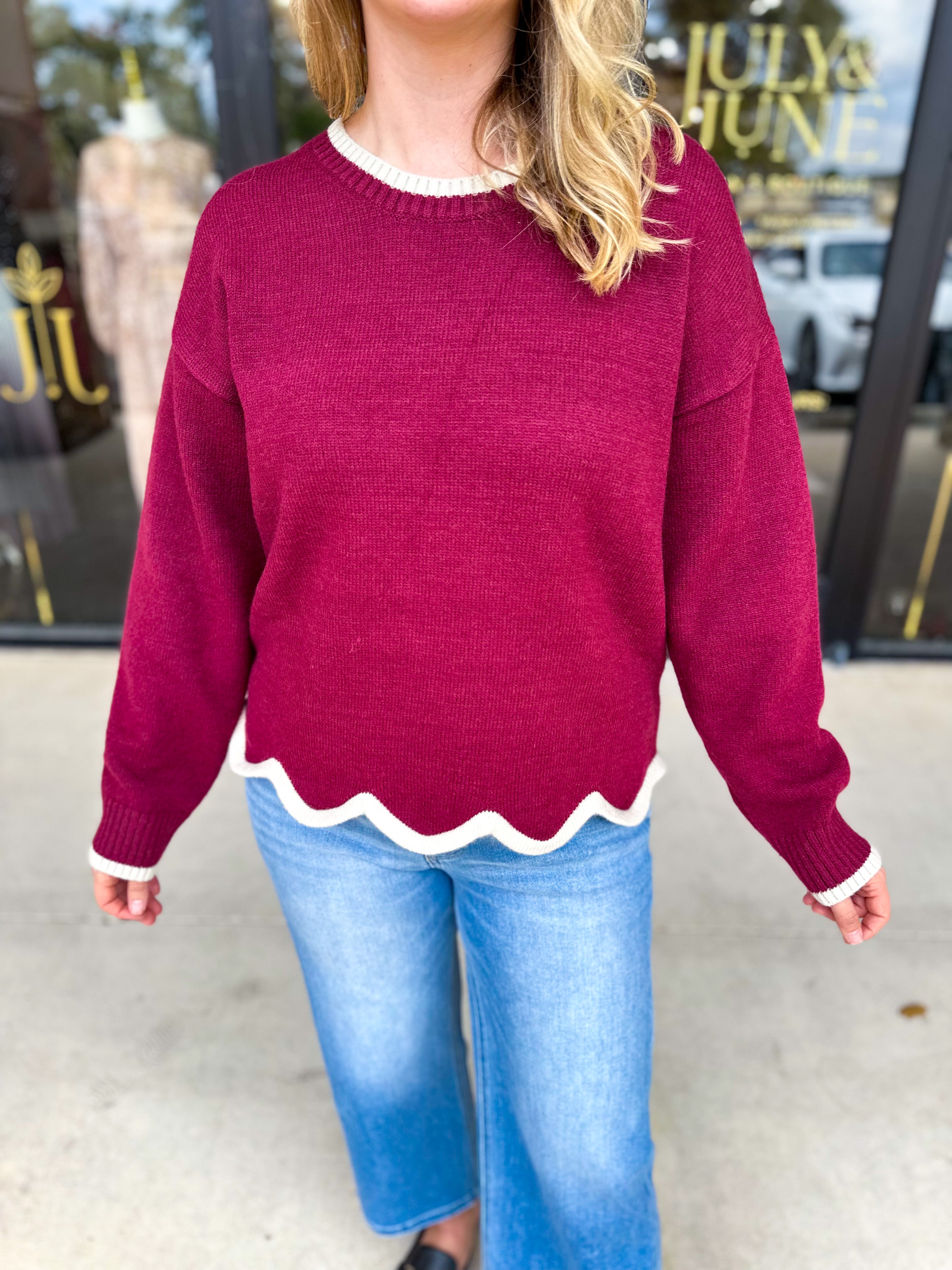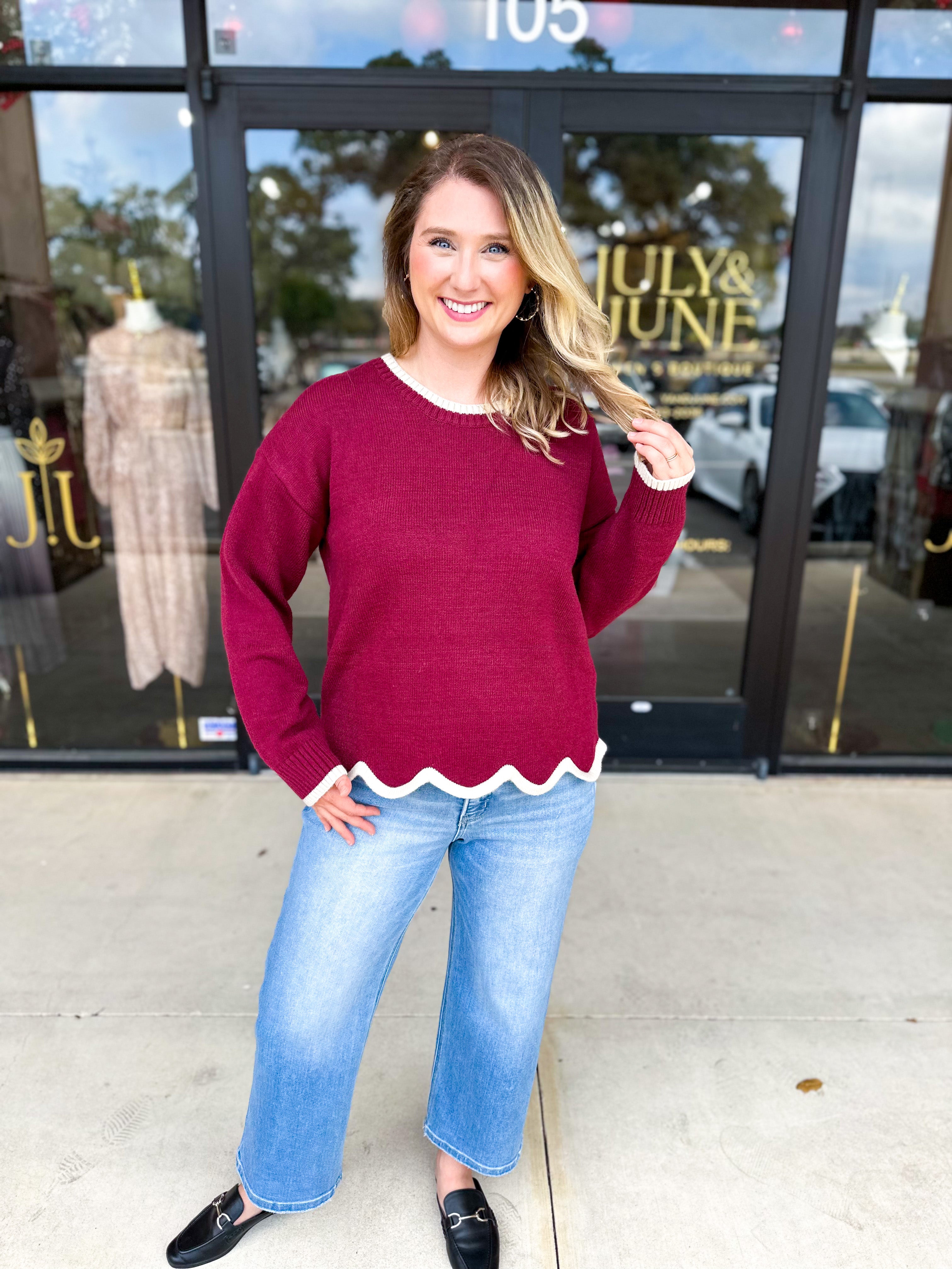 Scalloped Edges Sweater - Burgundy-230 Sweaters/Cardis-ENTRO-July & June Women's Fashion Boutique Located in San Antonio, Texas
