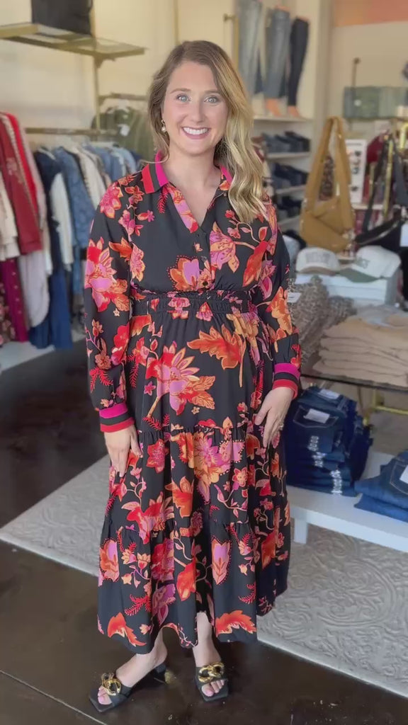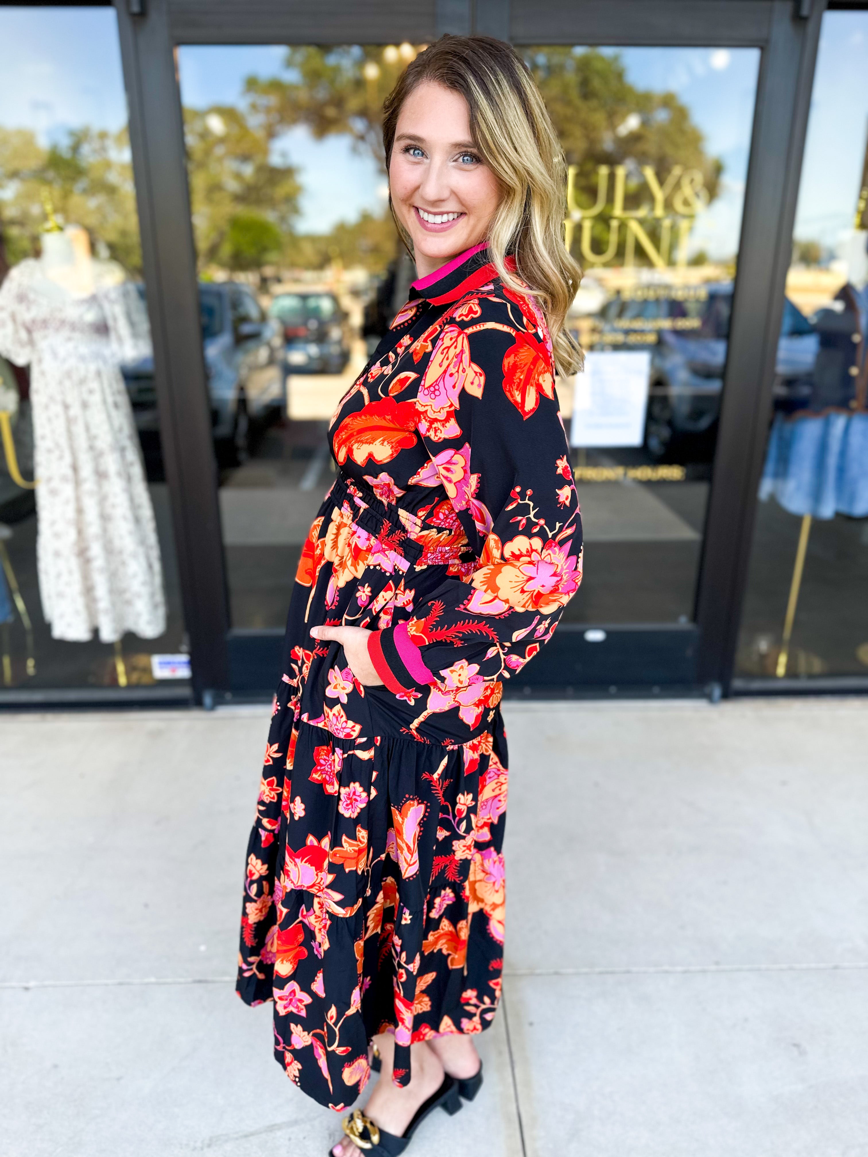 This Bold Paisley Floral Print Midi Dress features a rich and colorful floral paisley print that brings vibrant fall colors to a classic silhouette. Easy to style with your favorite fall accessories, making it an effortless choice for any occasion!
