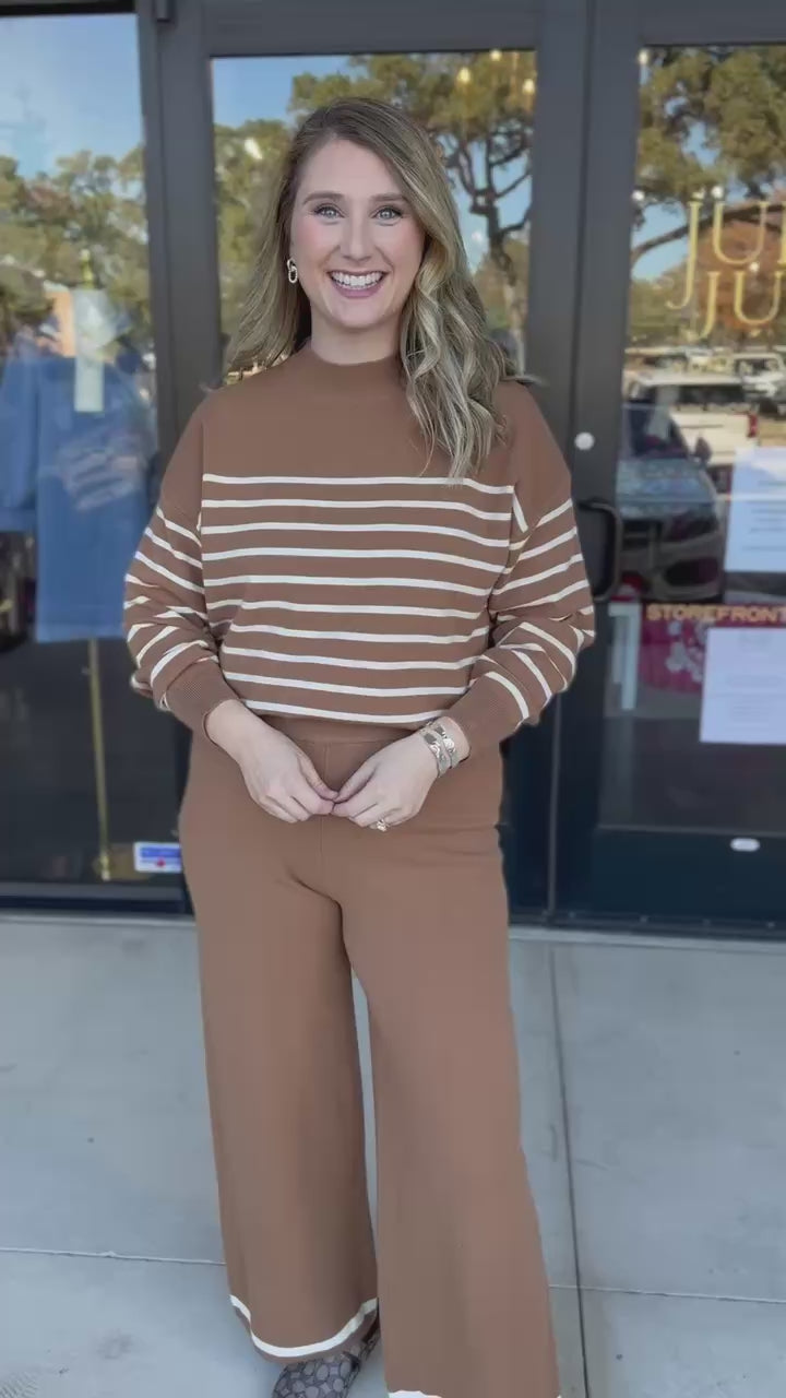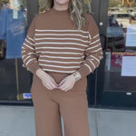 Our On Trend Sweater & Pant Set brings effortless comfort with a relaxed, easygoing feel. The soft knit fabric, wide-leg pants, and classic stripe details make it perfect for casual days, errands, or cozy evenings in. It’s a matching set that keeps you comfortable while still looking put-together!