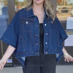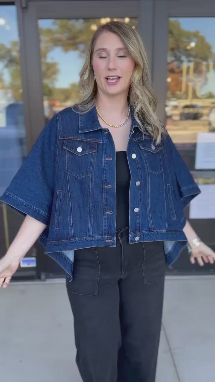 This denim poncho-style jacket brings a fresh twist to a classic favorite. With its wide sleeves, structured seams, and rich indigo wash, it delivers effortless cool without trying too hard. Throw it on over any outfit for an instant upgrade in comfort and style!