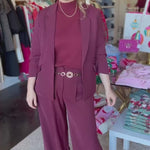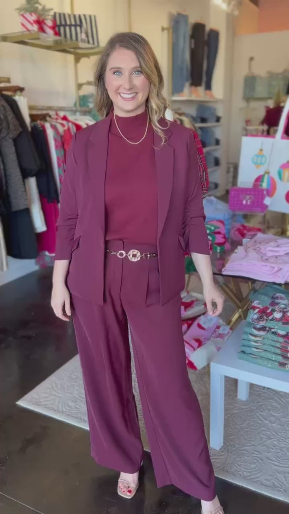 Elevate your wardrobe with the Wide Leg Trousers in the perfect Wine color. They effortlessly blend chic style with a classy touch. Easily wear during the winter season with your favorite sweater or blouse!