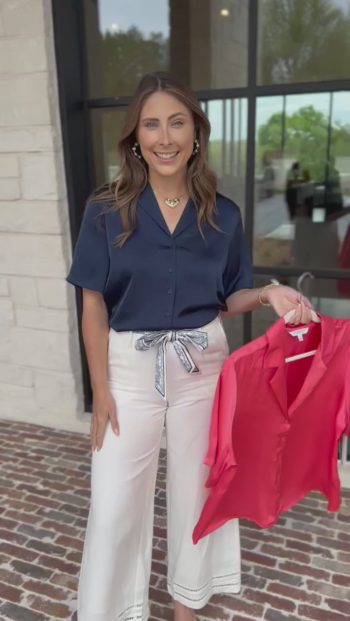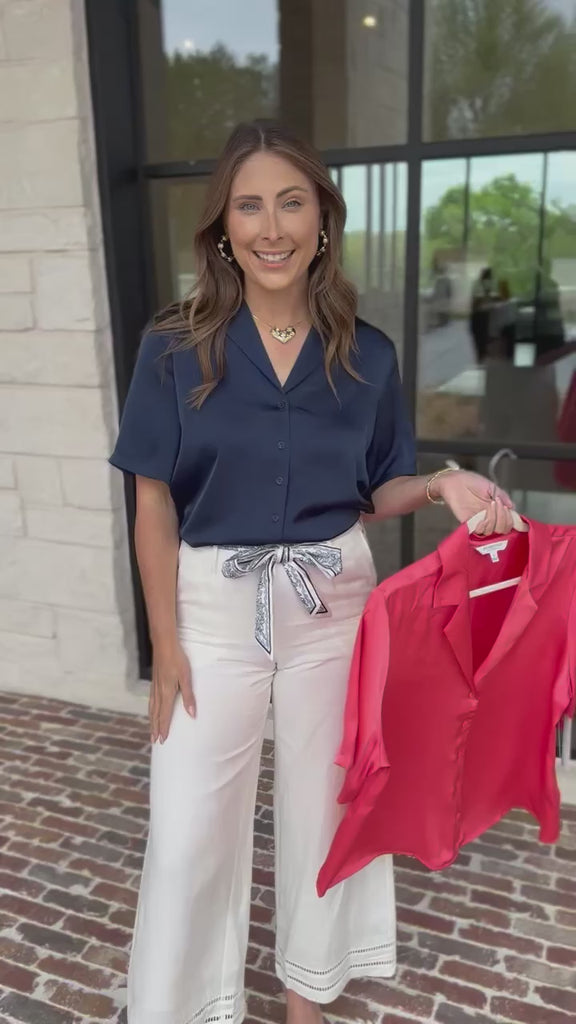 Throw on the Short Sleeve Satin Top in Navy and Coral for those laid-back moments where comfort meets style. This top will work with everything in your closet, making it your go-to piece for casual hangouts, date nights, work or any other summer days. Easy, breezy, and always in rotation!