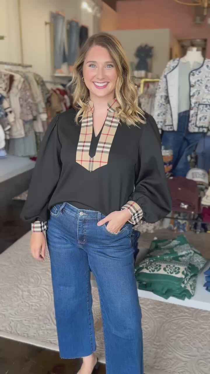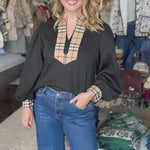 Experience the perfect blend of comfort and style with our Tan & Black Tartan Blouse. Crafted from buttery soft fabric and a pop of print, this elevated basic is designed to be your go-to everyday top. Stay comfortable and chic all day long!