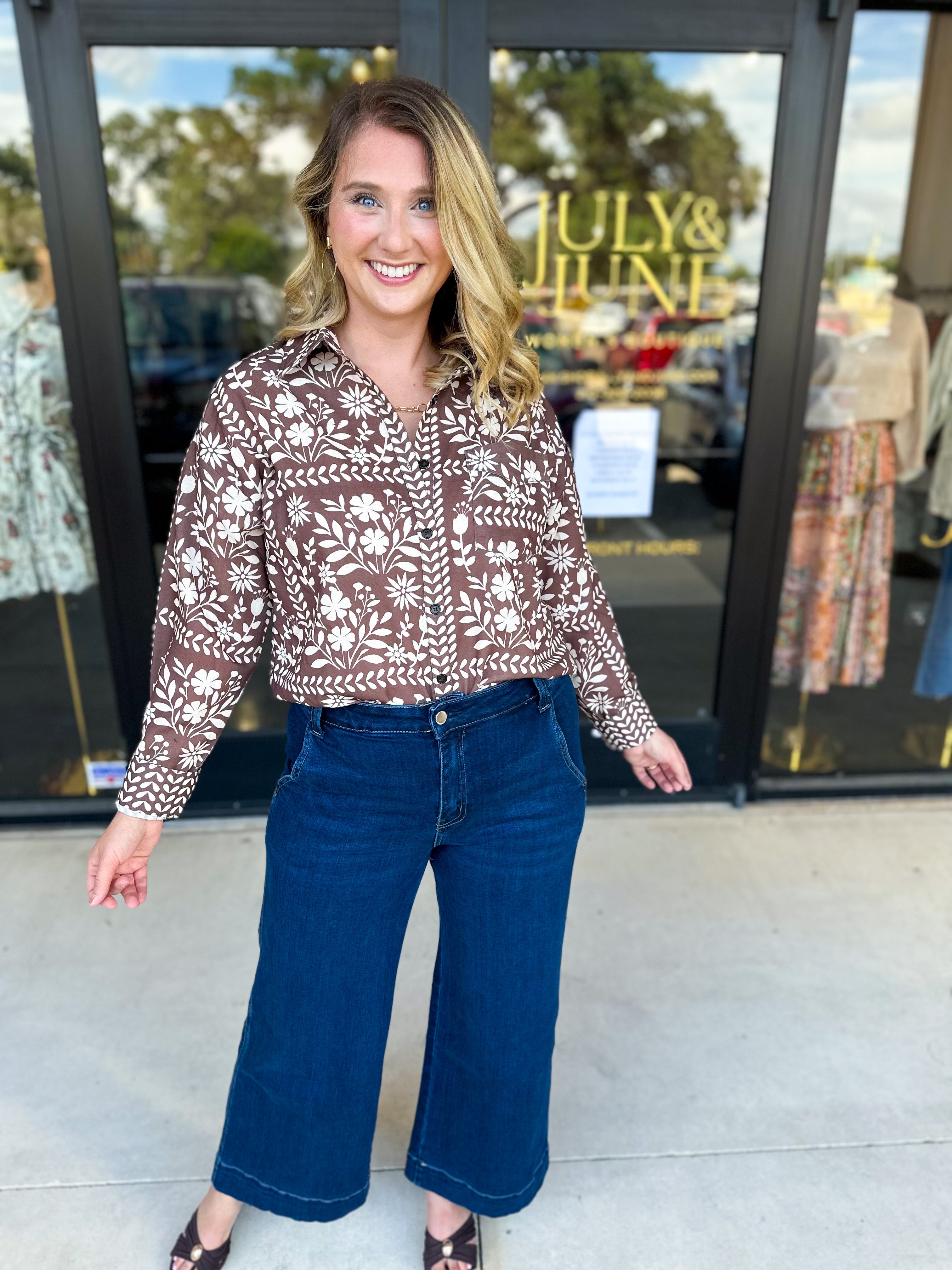 The Wrenlee Blouse in Chocolate Brown features a fresh fall print you'll adore. Its versatile design lets you wear it dressed up or down, easily adapting to your personal style. Effortlessly elevate your wardrobe with this must-have seasonal piece!