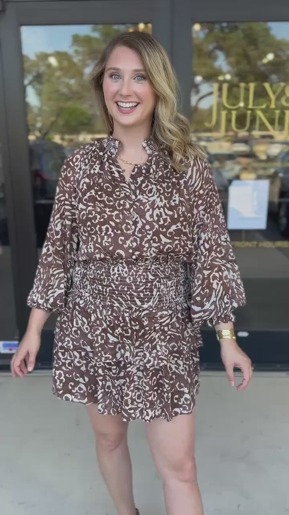 Bring a mix of sophistication and fun to your fall wardrobe with this Brown Leopard Mini Dress. Featuring an abstract leopard print enhanced by subtle shimmer threads, it's perfect for dressing up on date nights or festive holidays!