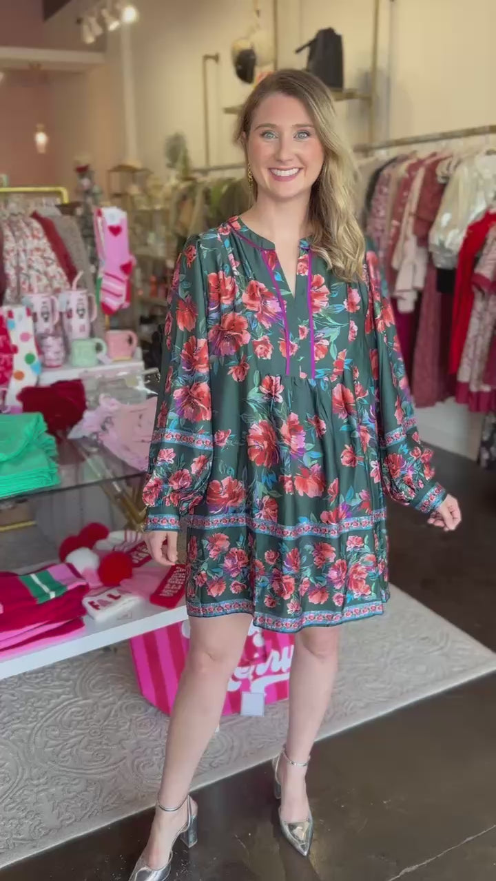 Introducing The Jewel Tones Floral Mini Dress! This dress showcases bold and rich colors in a lightweight satin fabric thst is sure to make you feel your best. Easy to wear and versatile enough for any occasion, it's a go-to piece that works whether you're dressing up or just simply wearing to a brunch with friends!
