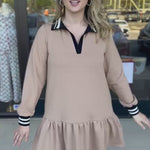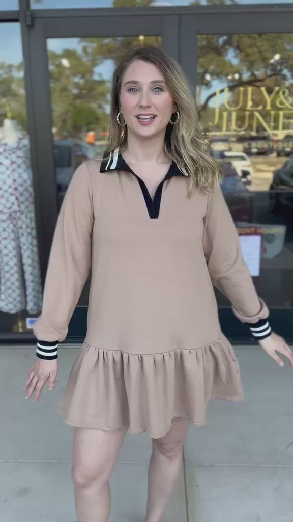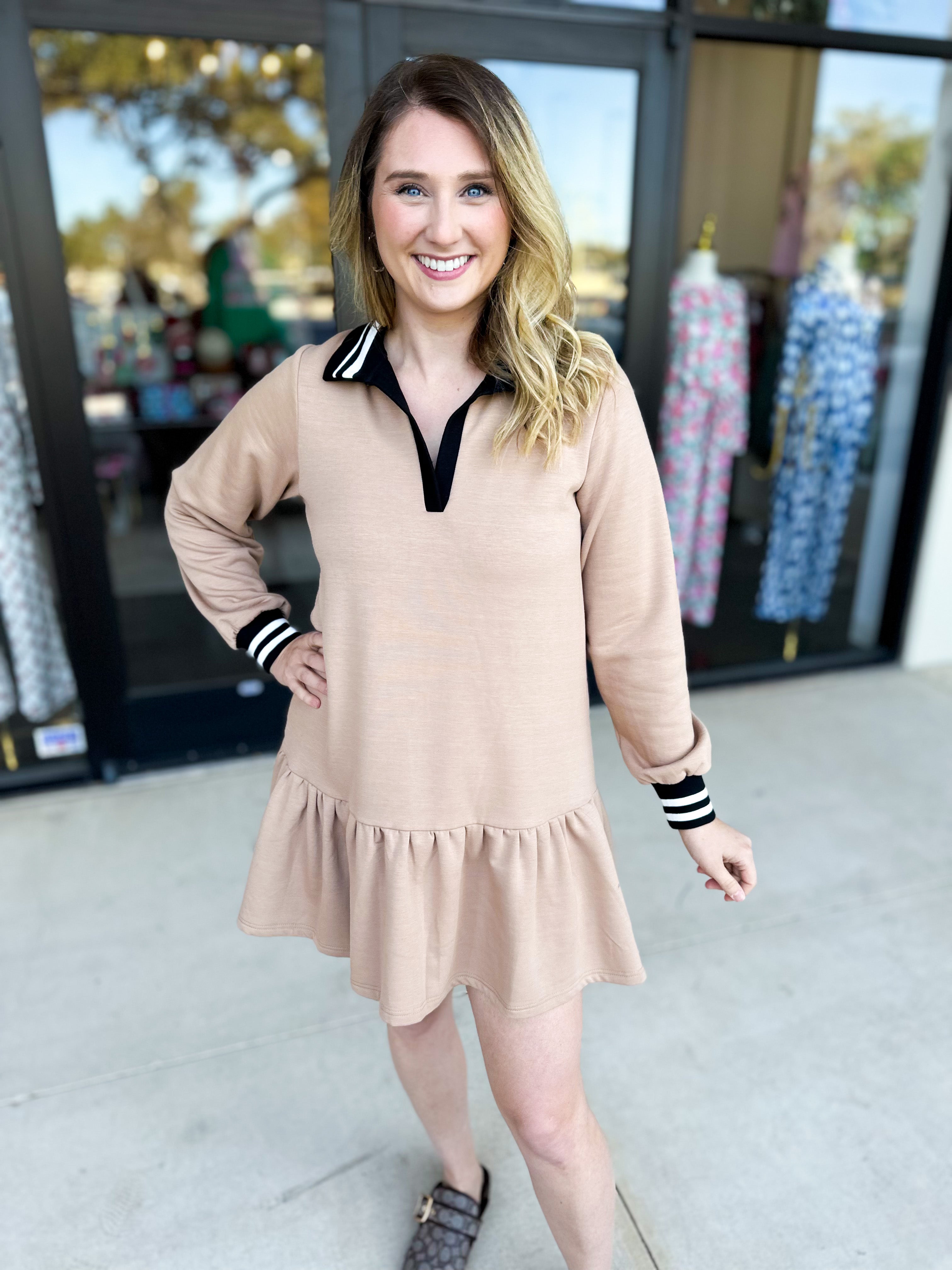 This casual tan dress is all about easy comfort with a fun, laid-back vibe. The black collar and striped cuffs add a touch of sporty charm without trying too hard. Finished with a soft, flowy drop waist, it’s the perfect throw-on outfit for relaxed days out and about!