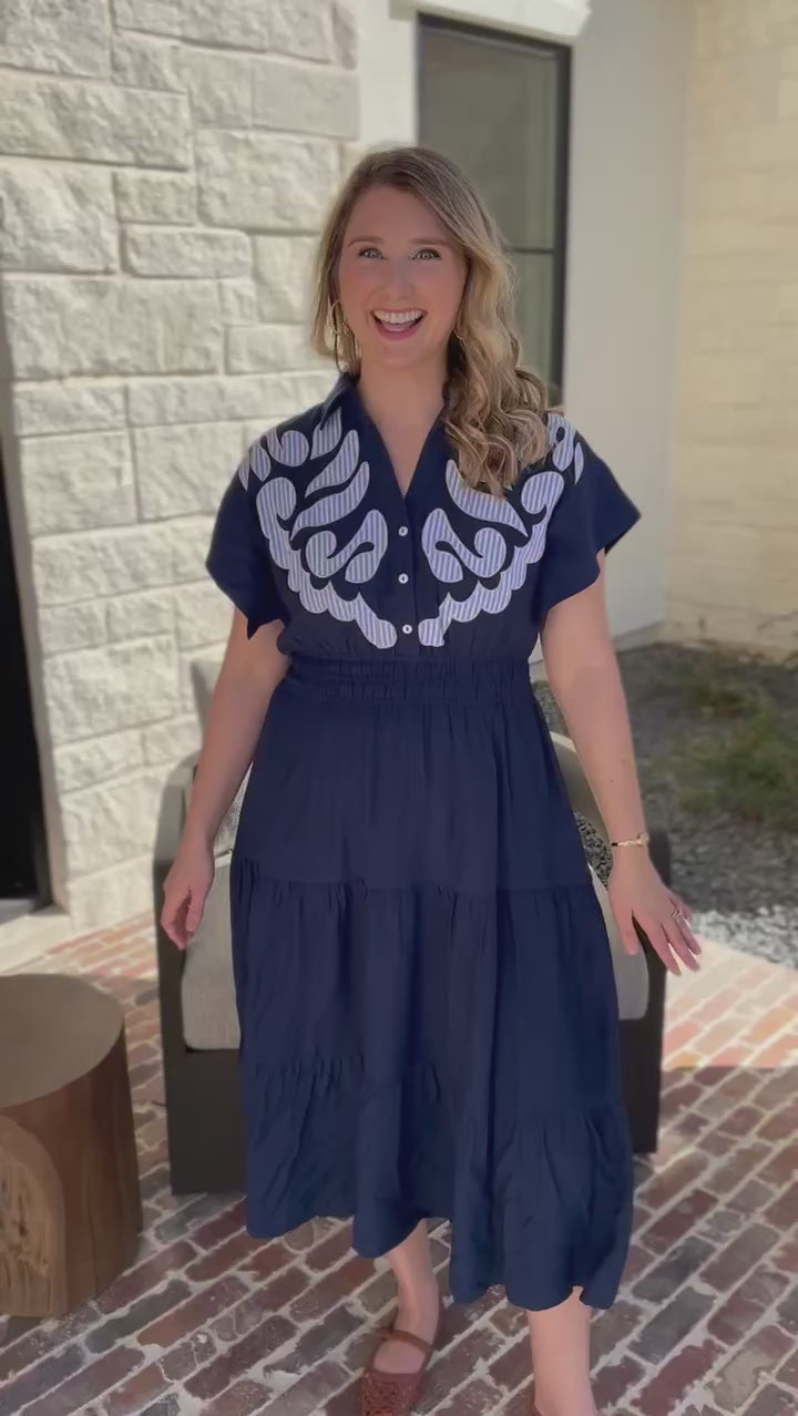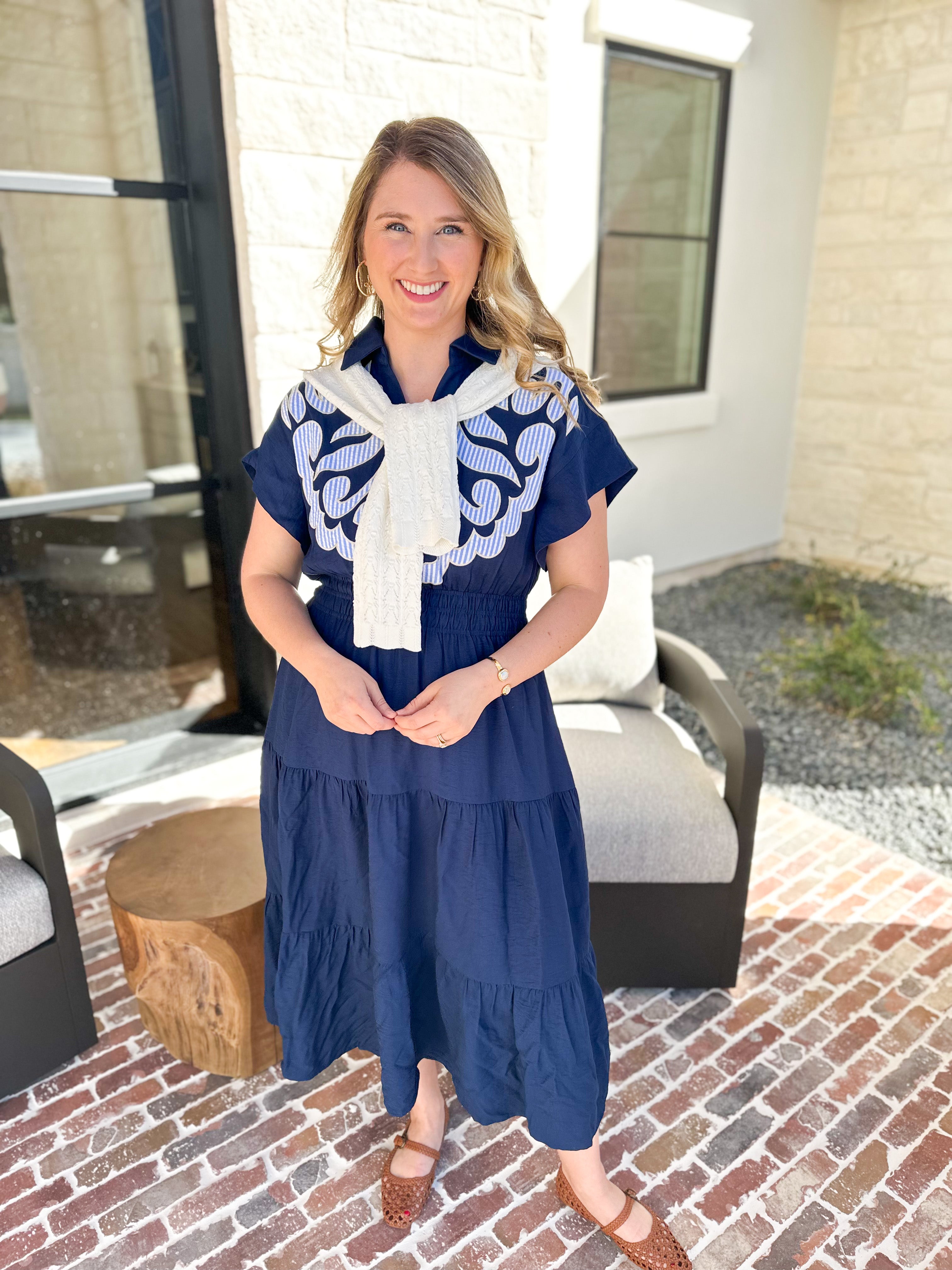 This Sutton Midi Dress from THML offers a timeless silhouette crafted from lightweight fabric and fun striped embroidery, making it perfect for any occasion. Its classic style allows you to effortlessly dress it up with heels or keep it casual with flats, ensuring versatile wear throughout the seasons!