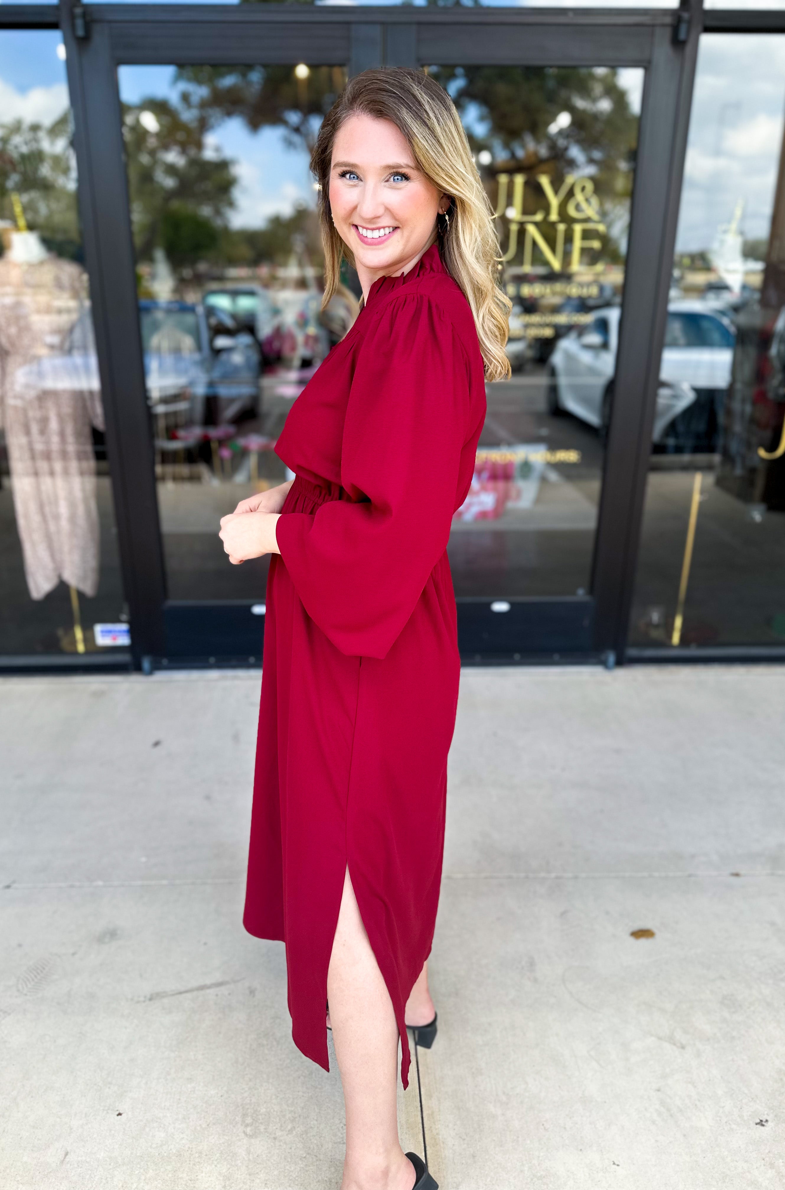 Meet your new go-to dress. Our Classic Midi Dress in Black and Deep Red features a simple and comfortable silhouette that feels as good as it looks, making it the one piece you'll reach for whether you are dressing up or keeping it casual!