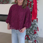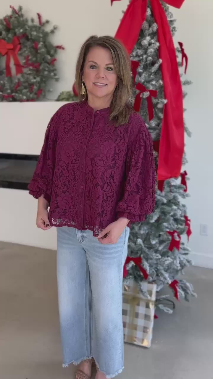 Elevate your look with this Merlot Lace Button Down Blouse, featuring a rich burgundy hue and delicate lace detailing. Its refined style makes it an effortless choice for dressy holiday parties or sophisticated work events!