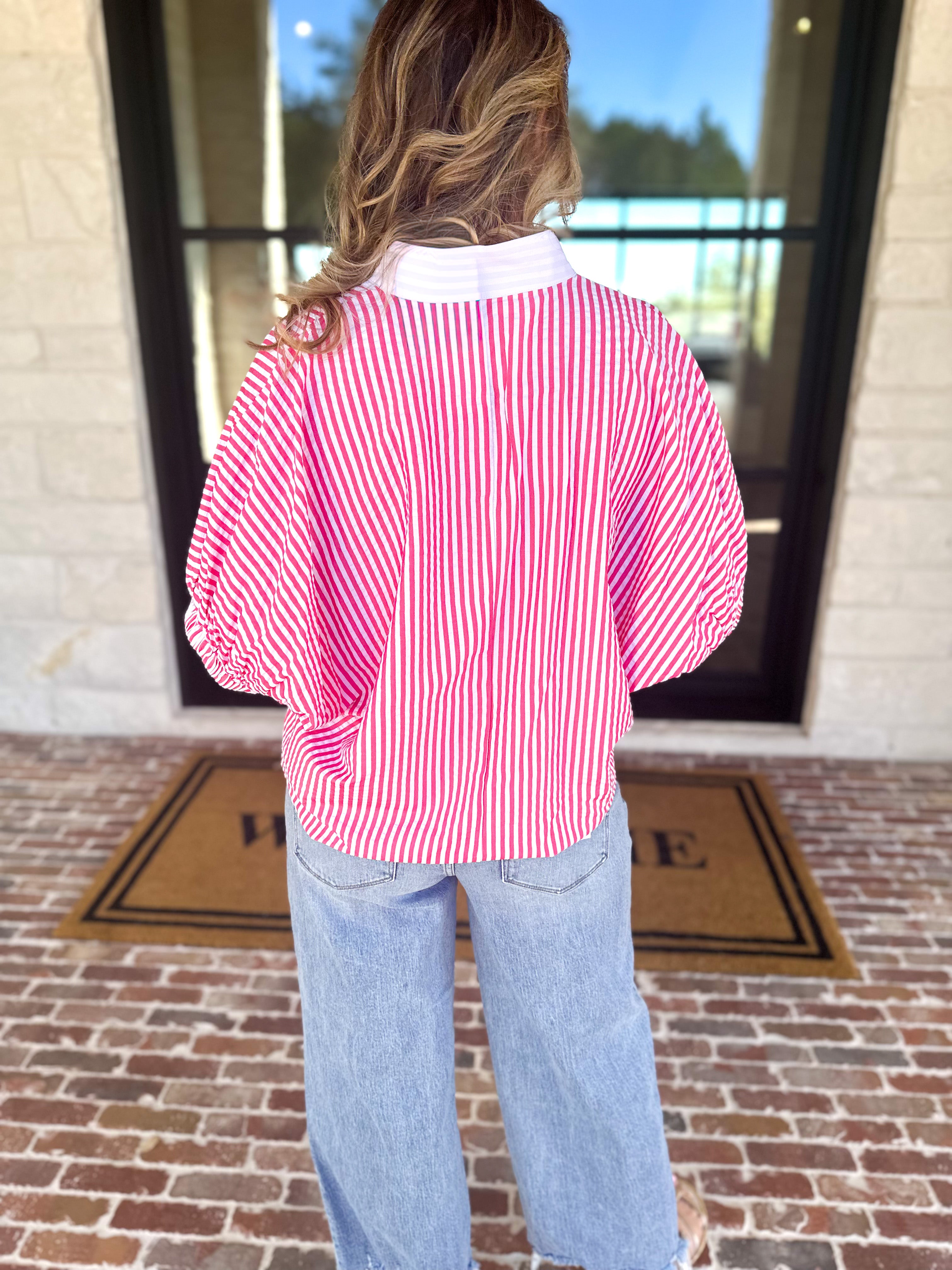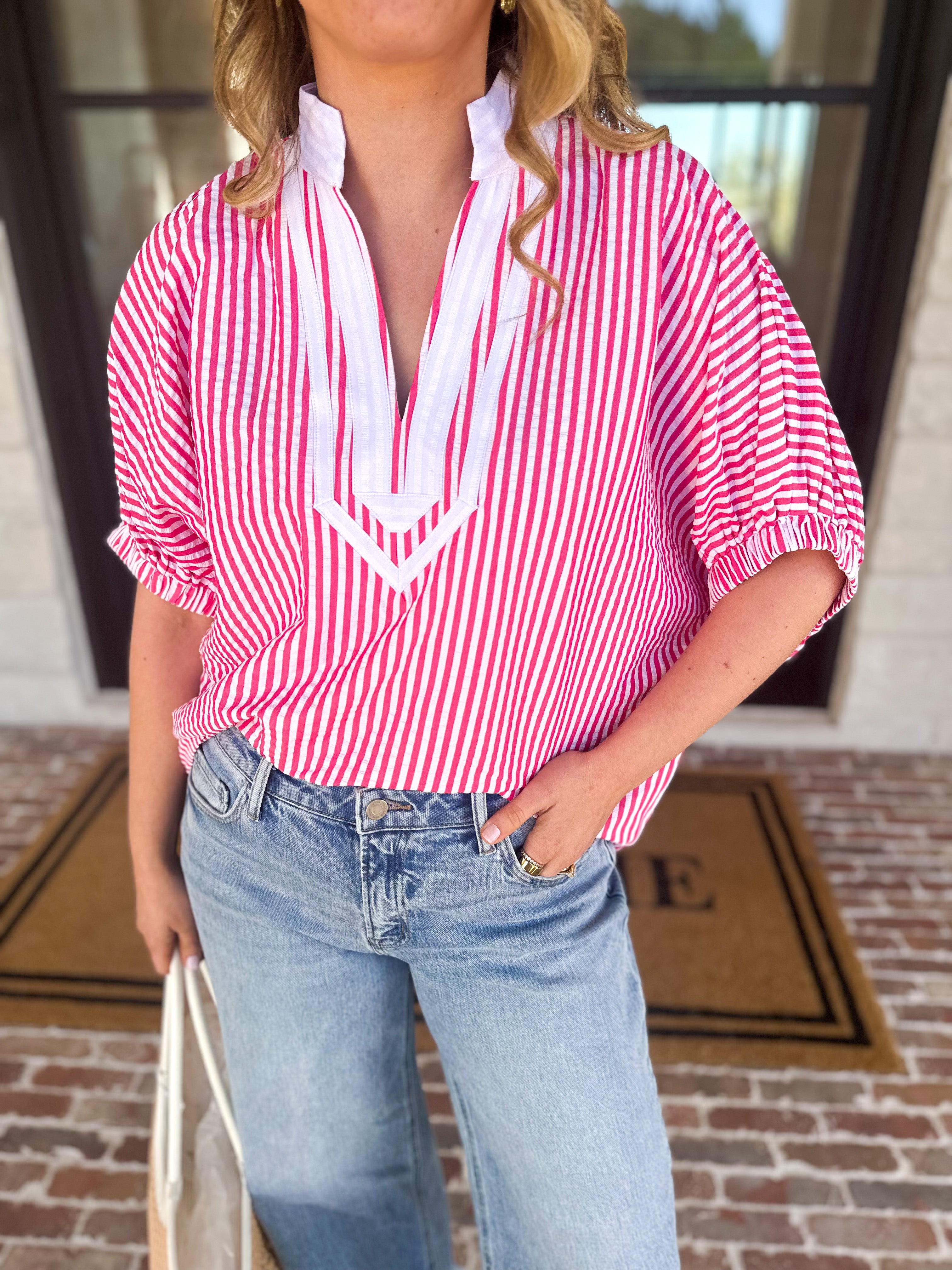 Get ready to fall in love with a customer favorite that we have brought back in a new print! The Seersucker Sweet Blouse in Light Blue and Pink will be your new fav top! Easy and effortless that you can style in your own way!
