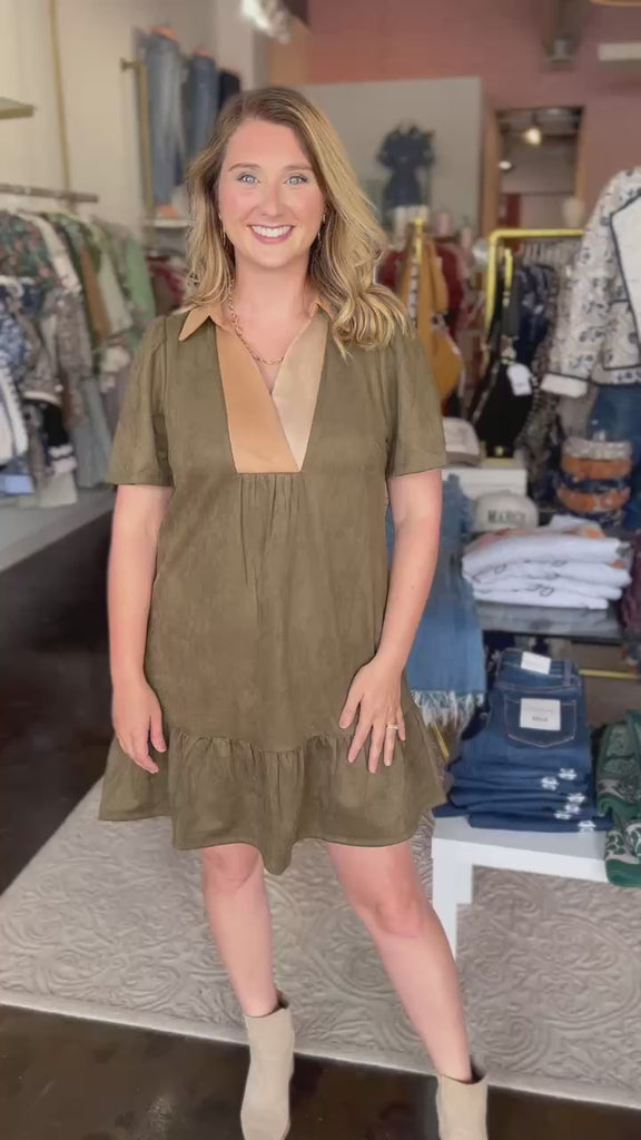Crafted from soft suede, this Olive & Tan Suede Mini Dress is a fall essential that effortlessly transitions from day to night. Its rich tones and sleek silhouette make it easy to dress up for special occasions, offering both comfort and style with minimal effort!