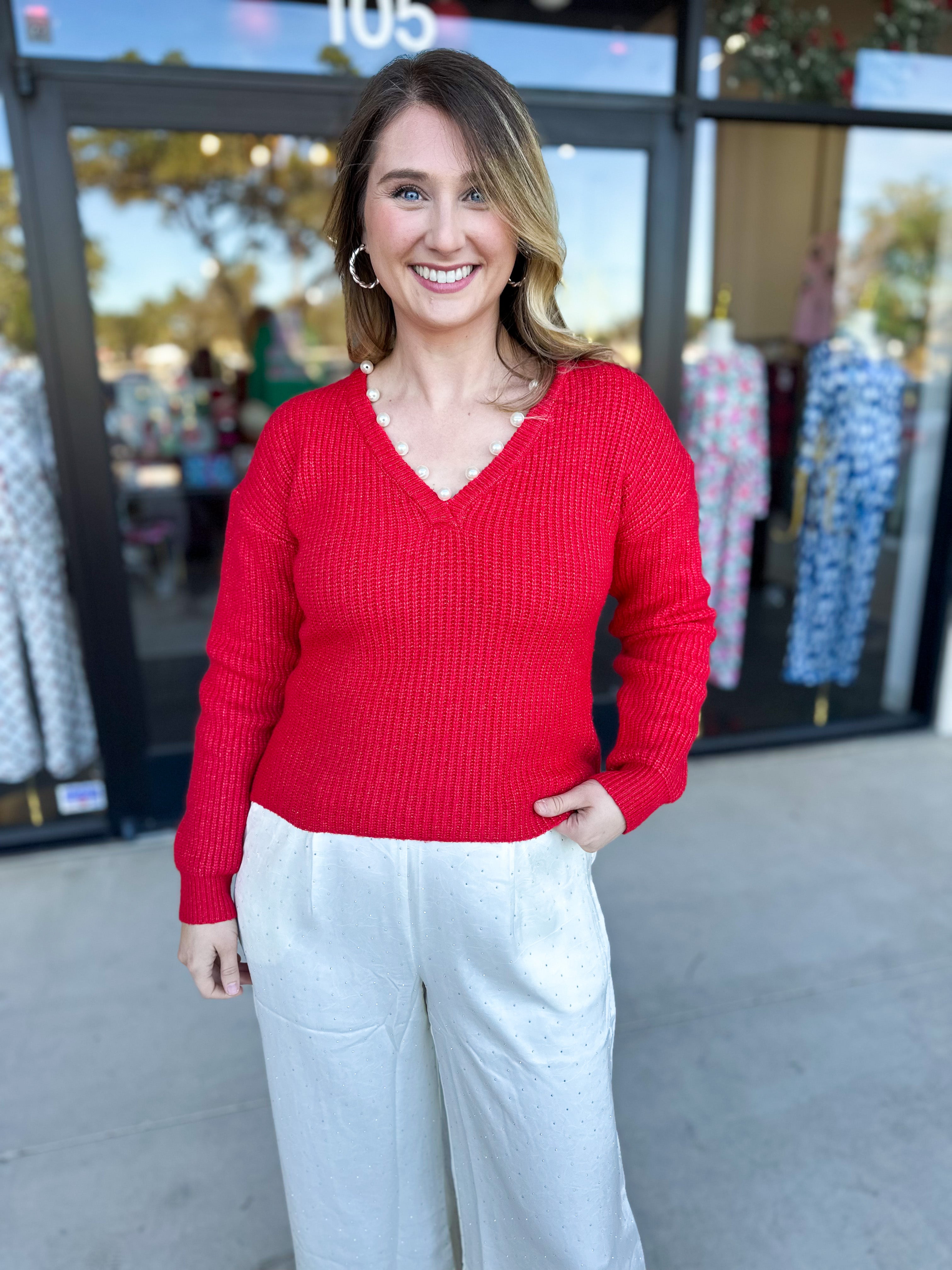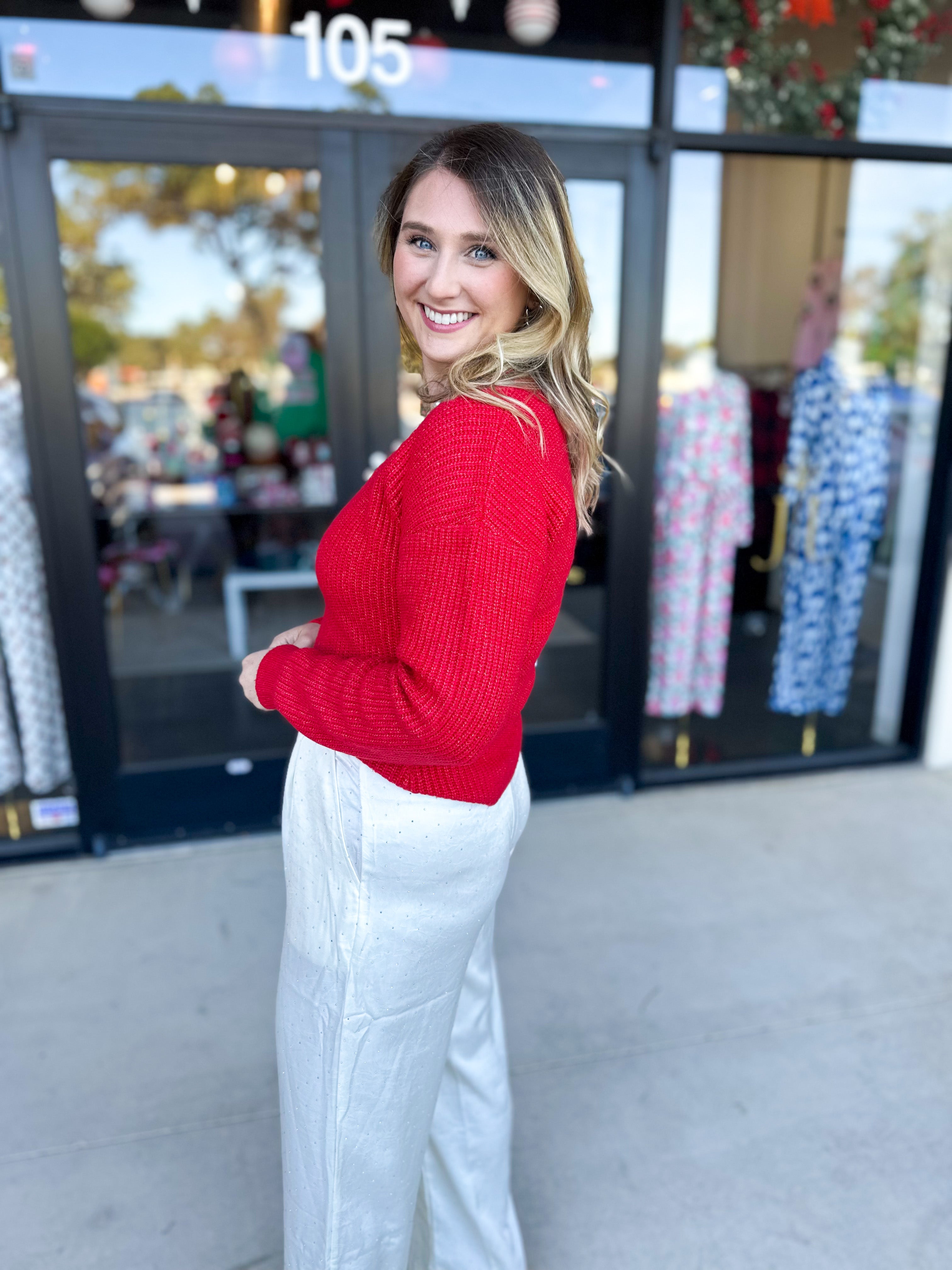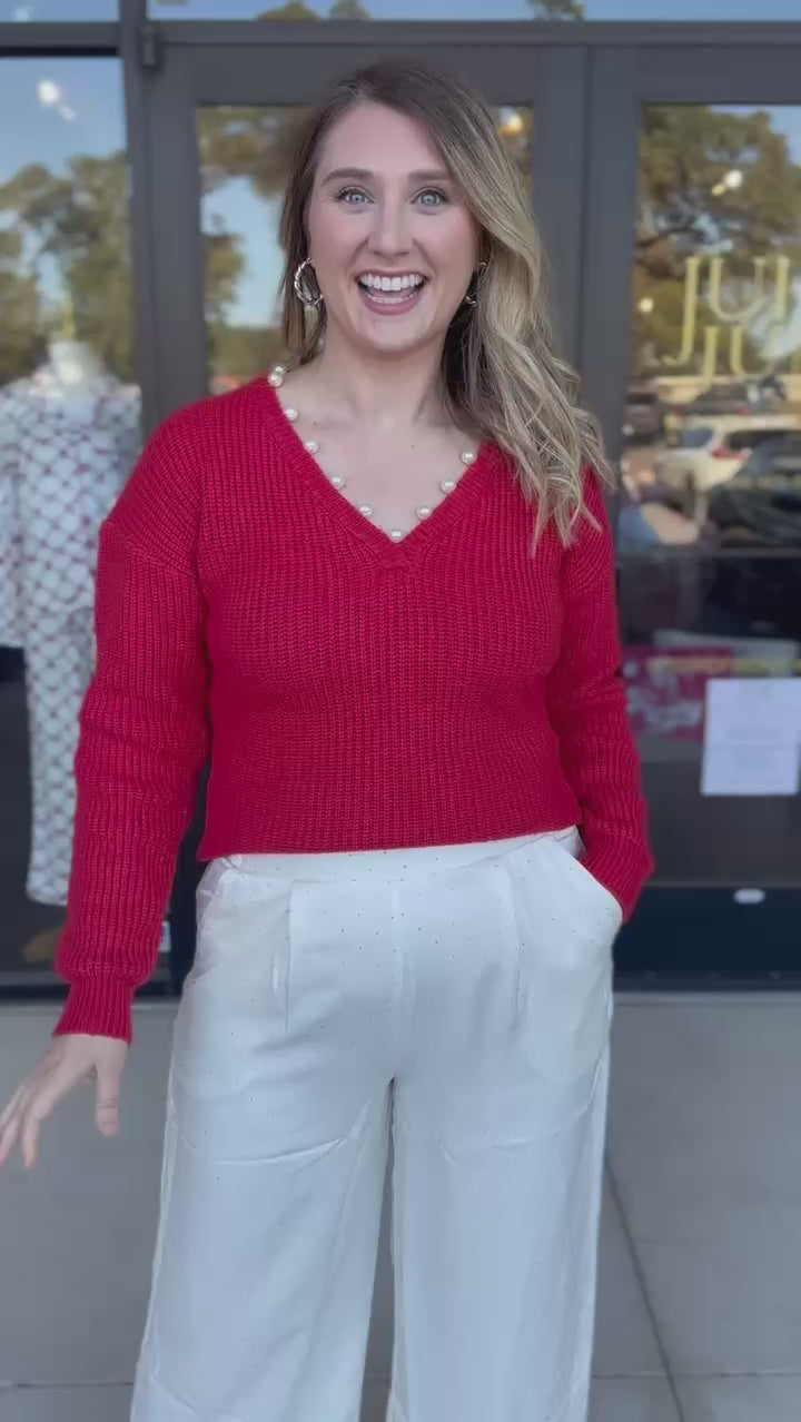 Get ready for the winter season with the Cherry Pearl Sweater. Its soft fabric makes it so comfortable while the pearl details adds class and elegance! Easily wear for any holiday party, date night or just for everyday!