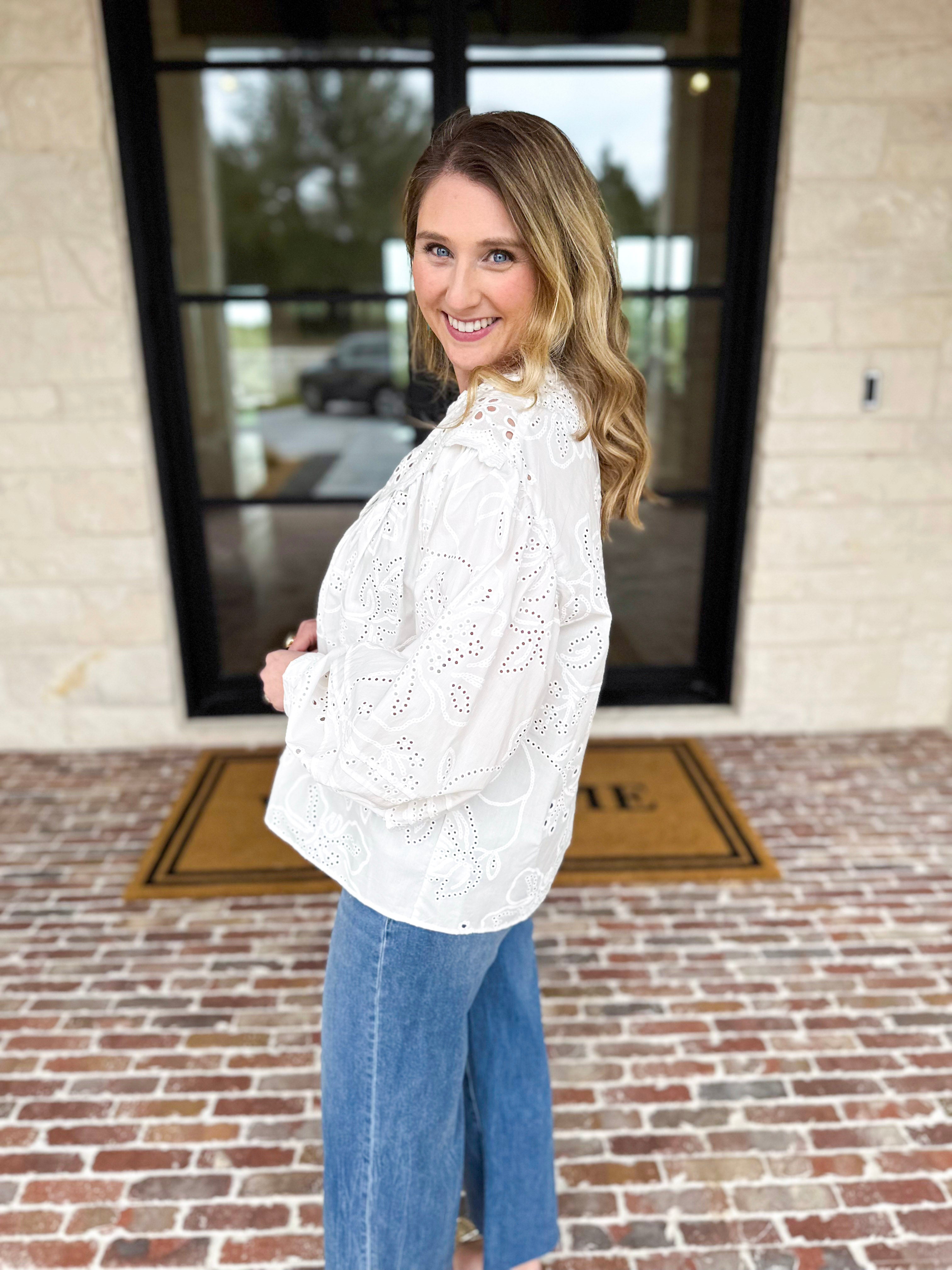 Elevate your everyday wardrobe with this timeless white eyelet lace blouse, where delicate lace meets playful feminine style. The peasant style silhouette pairs effortlessly with everything from casual shorts to your favorite denim, making it a versatile staple!