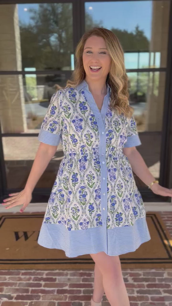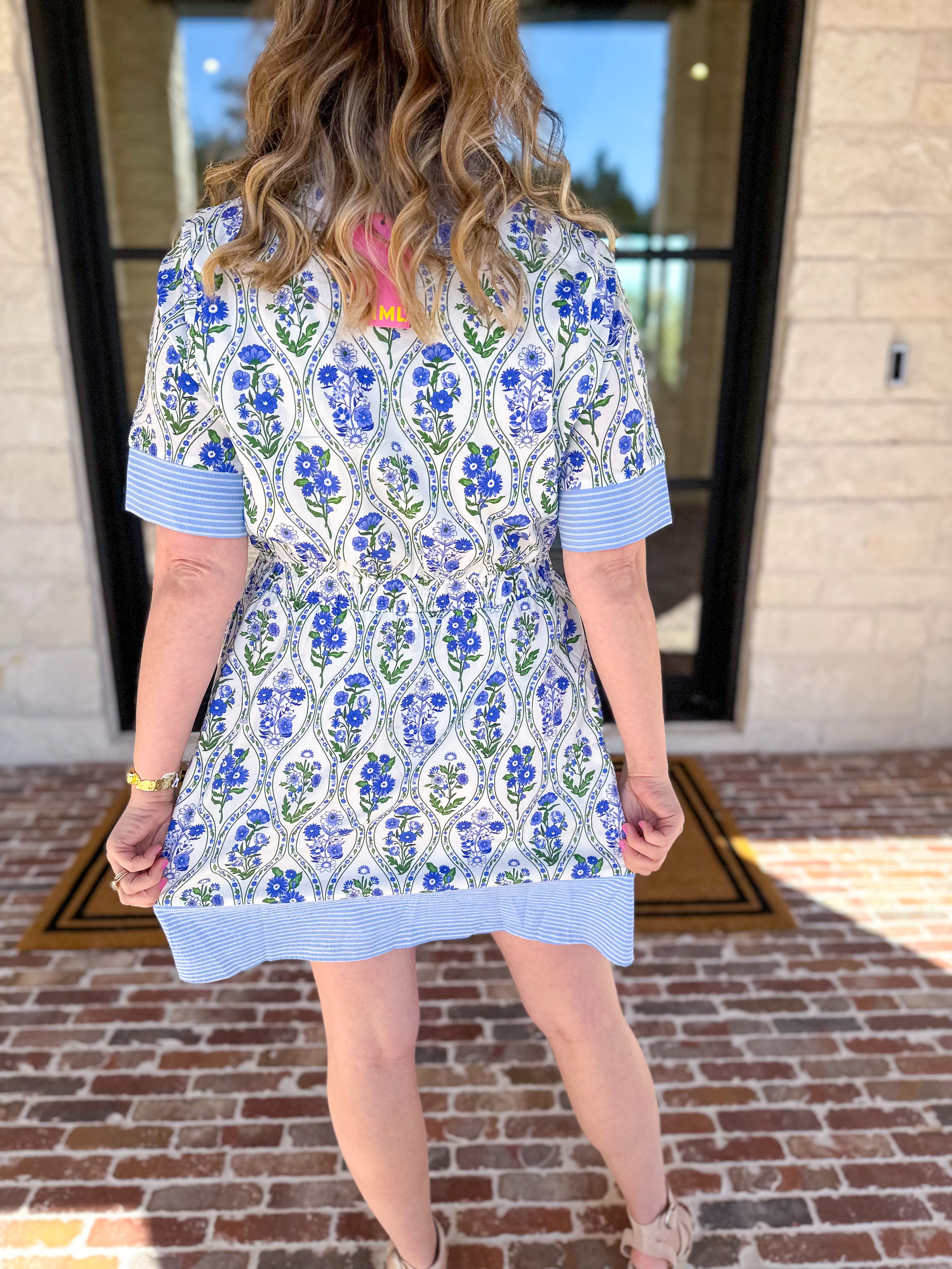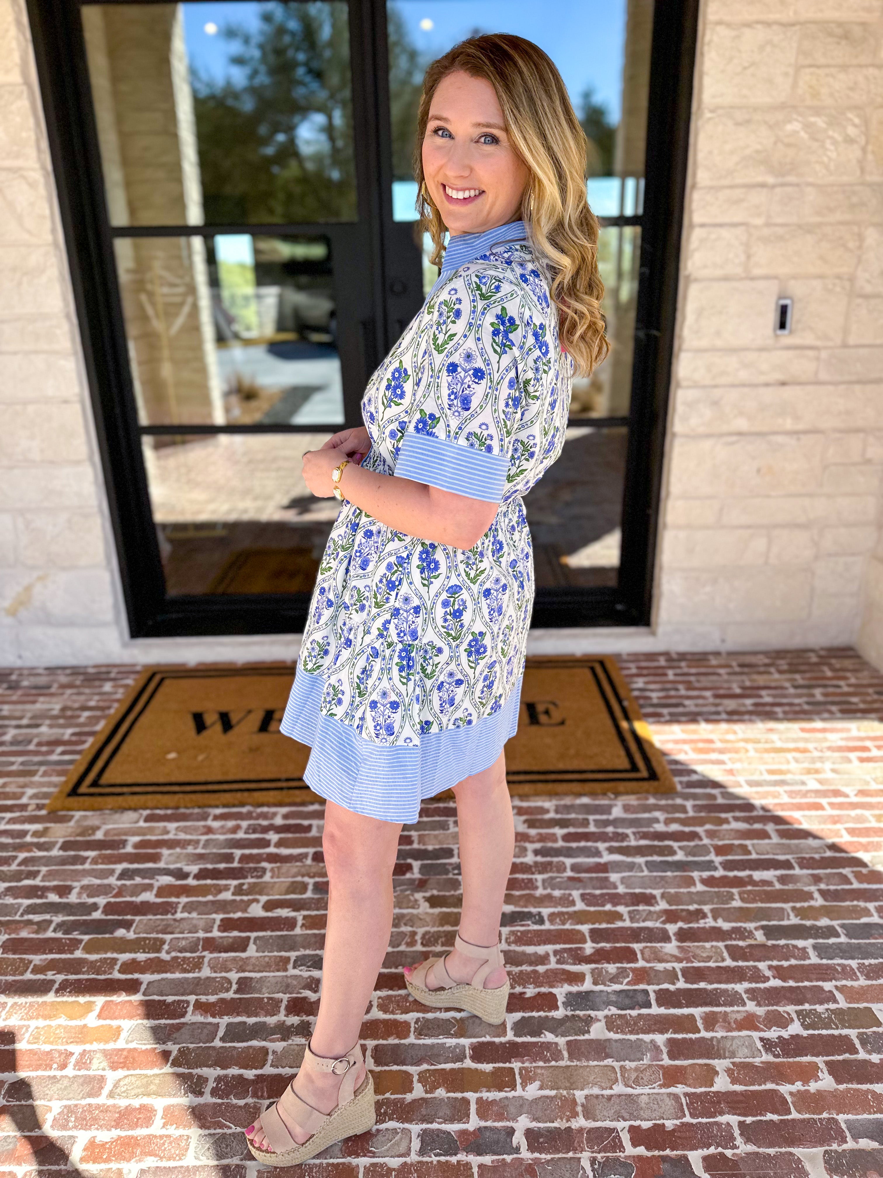 Embrace the season in our Violet & Blue Floral Garden Mini Dress! A charming mix of florals and stripes, where timeless style meets a classic silhouette for a perfect spring look. Light, breezy, and effortlessly stylish—your new spring essential!