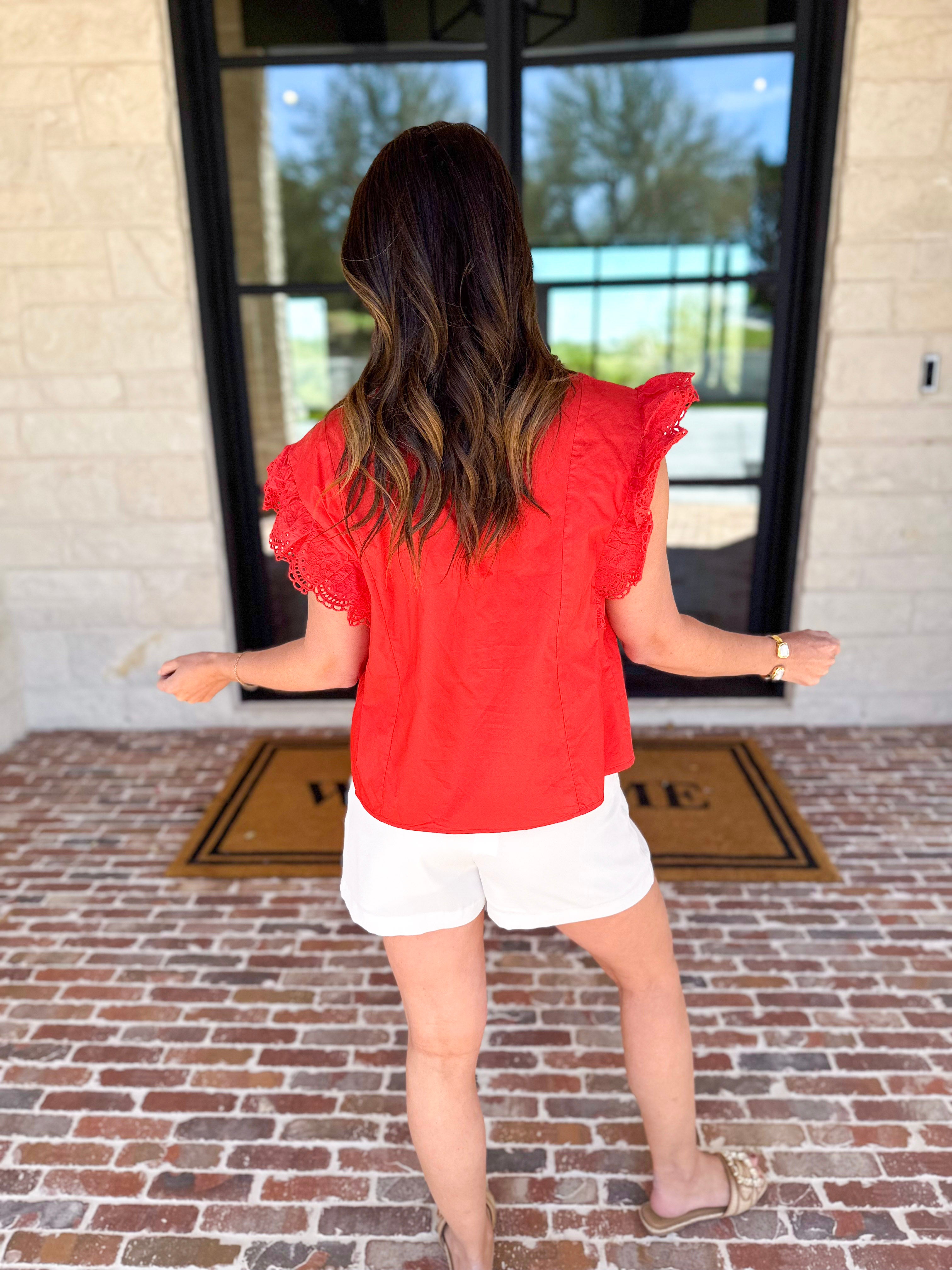 Tomato Red Embroidered Blouse-200 Fashion Blouses-FATE-July & June Women's Fashion Boutique Located in San Antonio, Texas