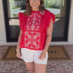 The Tomato Red Embroidered Blouse is bold, vibrant, and impossible to miss. Featuring Ivory embroidery across the top and eye-catching statement ruffle sleeves, it brings just the right mix of detail and playfulness. Pair it with denim or shorts—either way, it’s a standout piece you’ll reach for again and again!