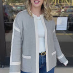 The Grey Color Block Cardigan fits true to size. Our model is wearing the size Medium. She is a 34c, 5'7 and 29 in jeans. Stay true to size! Size down if you are in between sizes and/or more petite.