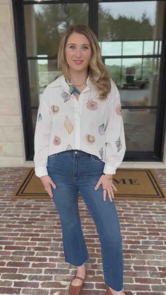 Meet your new go-to blouse. This linen button-down features a charming seashell embroidered detail that brings subtle coastal vibes to any outfit. The relaxed fit and natural fabric make it ideal for throwing on with jeans, linen pants, or shorts—no fuss required. Whether you're heading to the beach or just want that breezy, laid-back feel!