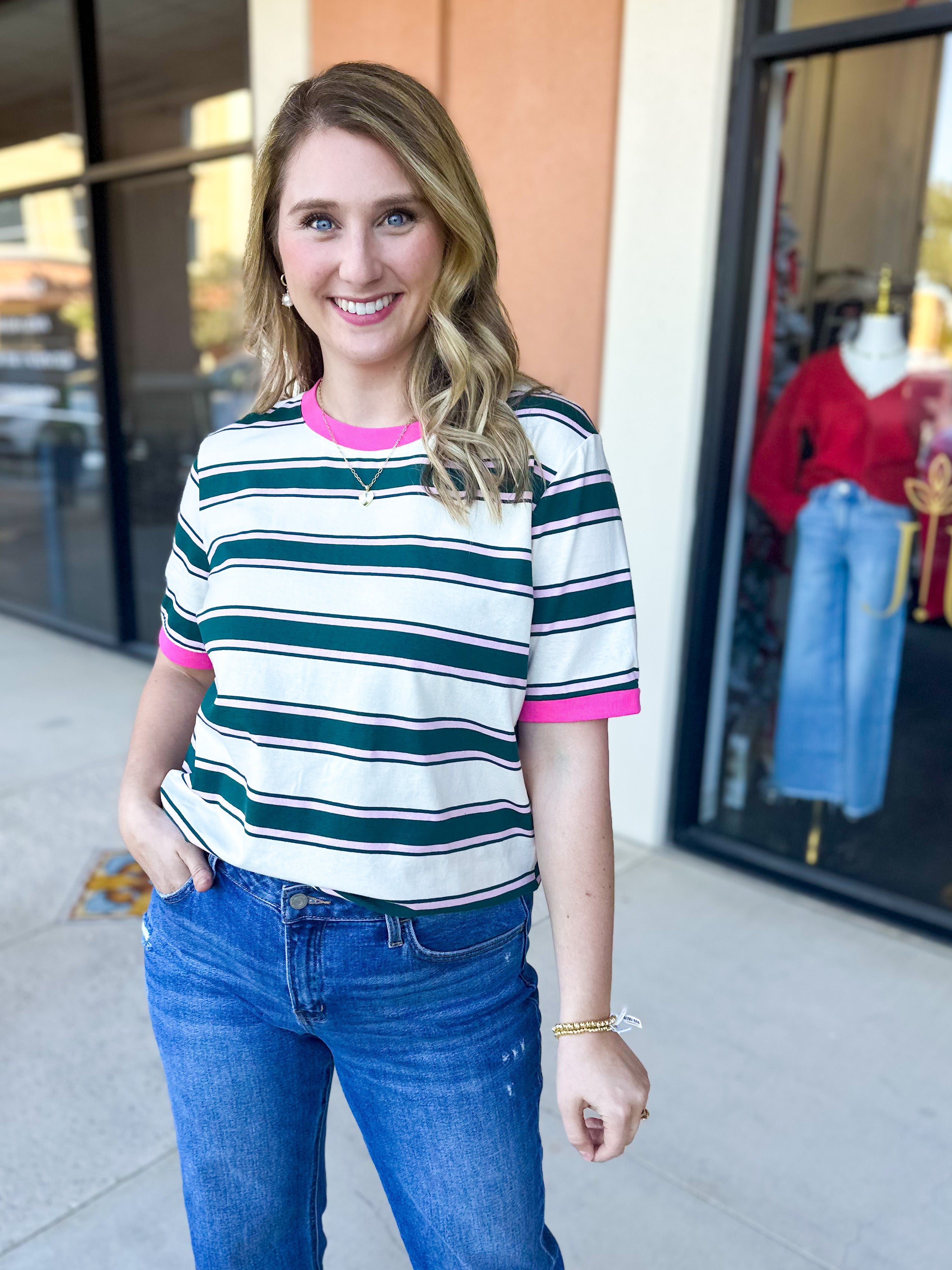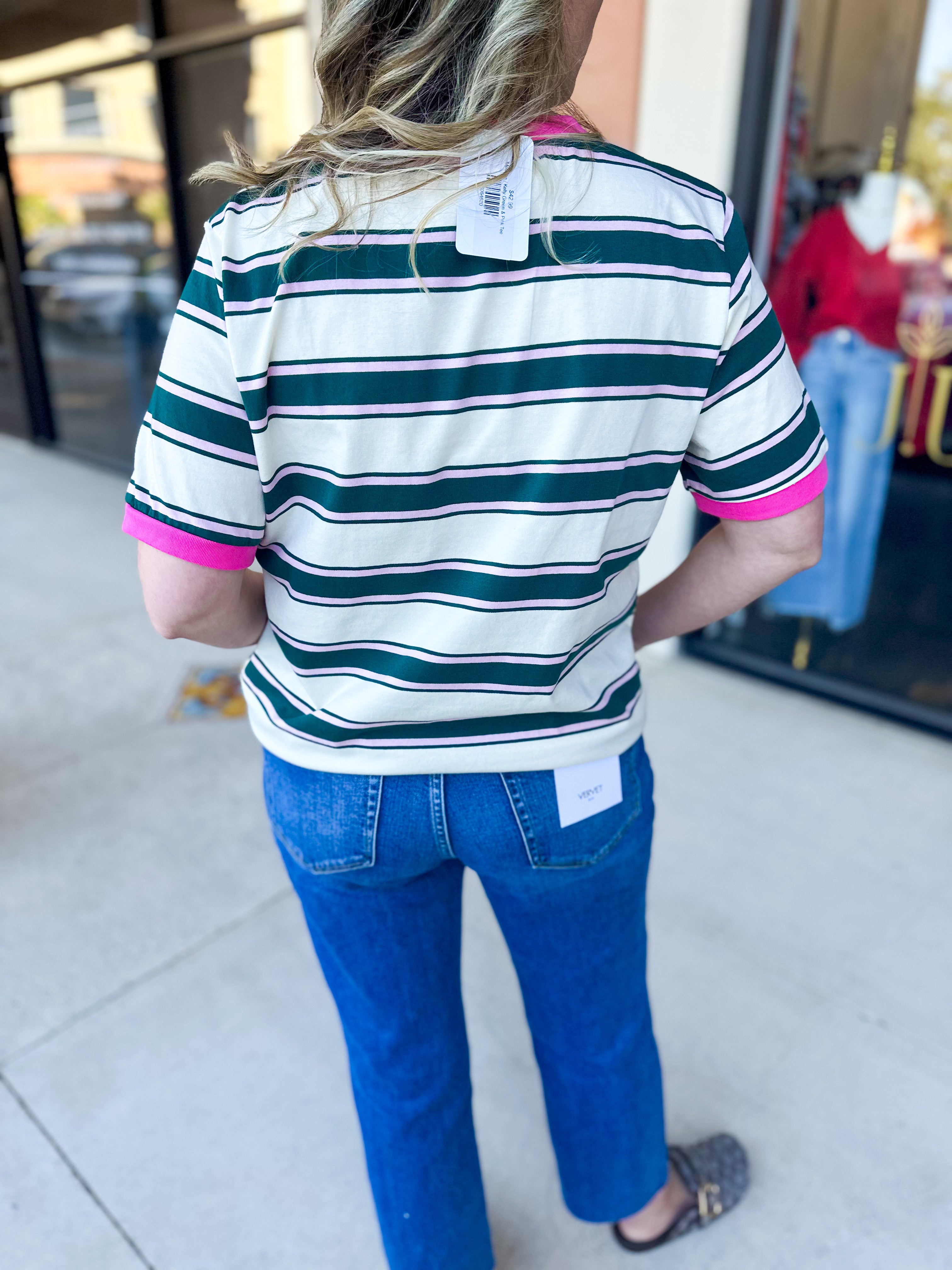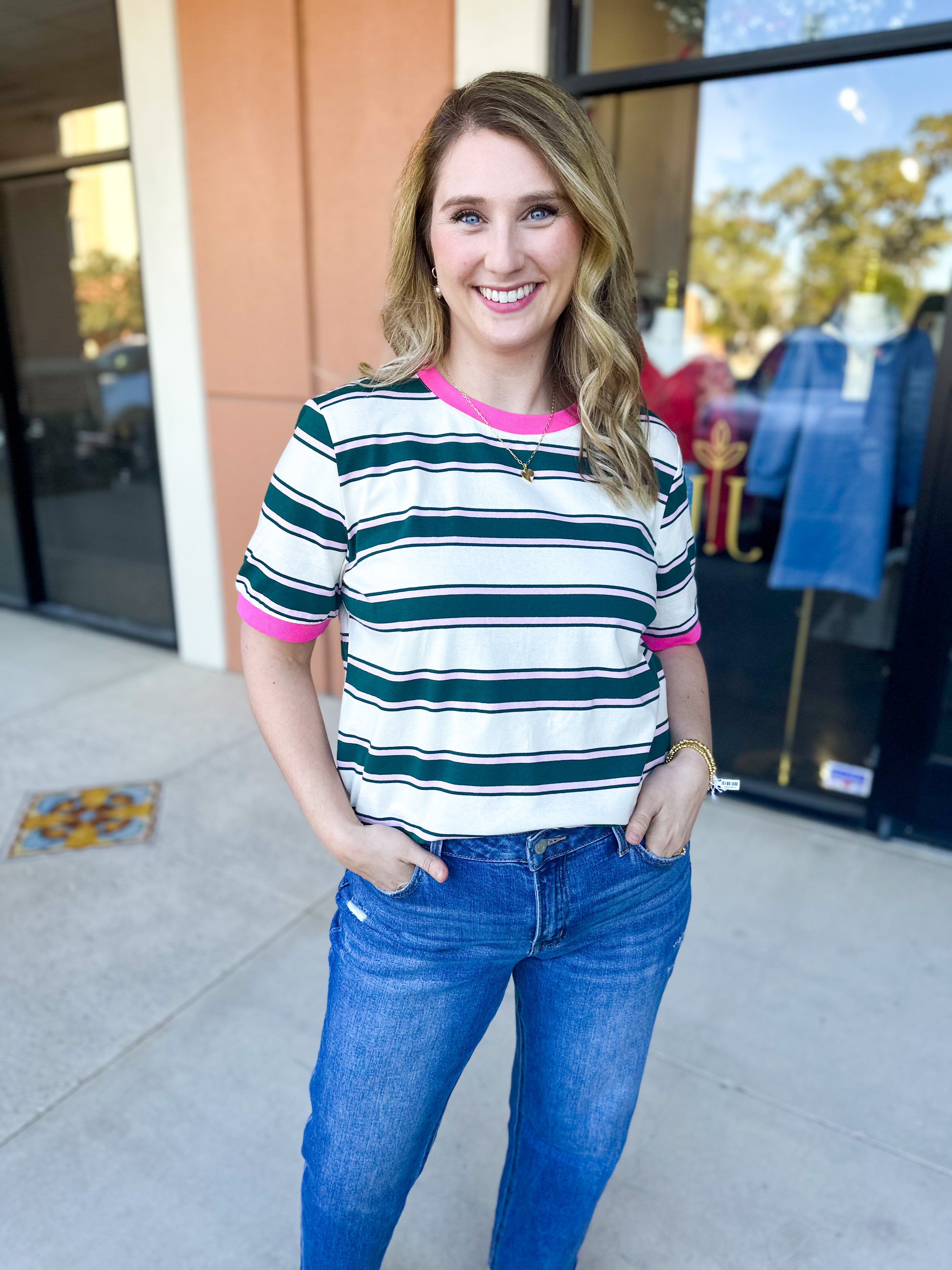 Throw on this Kelly Green & Pink Tee and you've got instant style sorted. The playful stripes bring just enough personality to elevate your everyday look, whether you're layering it under a jacket or letting it stand alone. Comfortable enough for all-day wear!