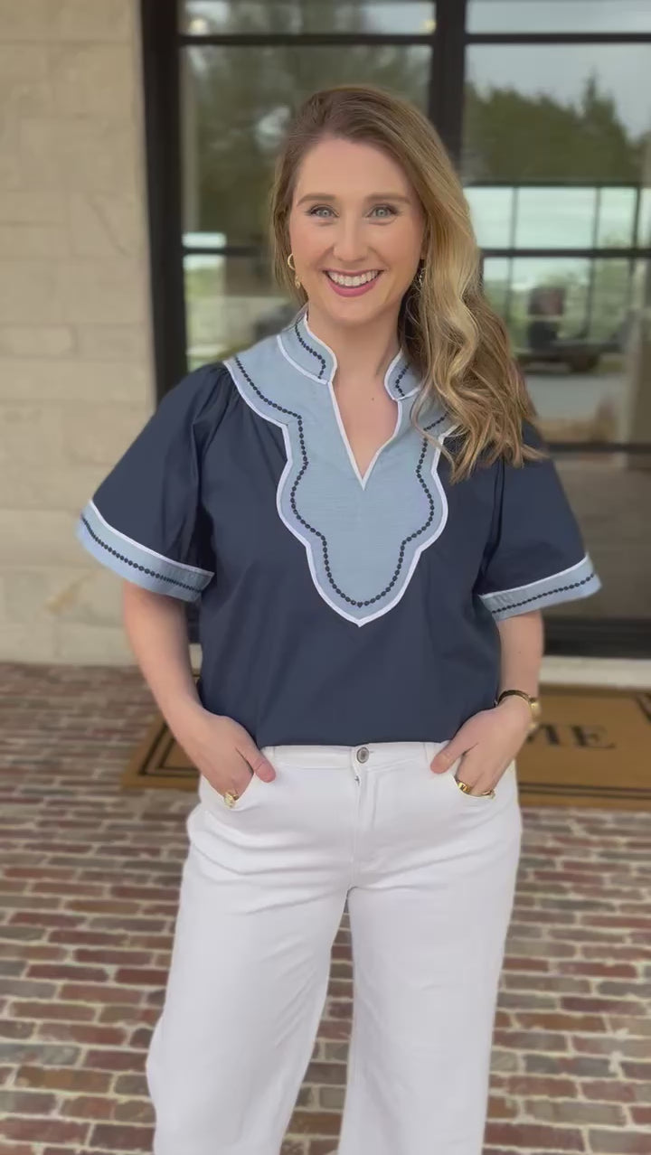 The Navy & Light Blue Blouse is all about charming details and easy elegance. With its contrast trim, scalloped neckline, and breezy sleeves, it adds a pop of personality to any outfit. Perfect for dressing up your everyday denim or pairing with crisp white pants for a fresh, feel-good look!