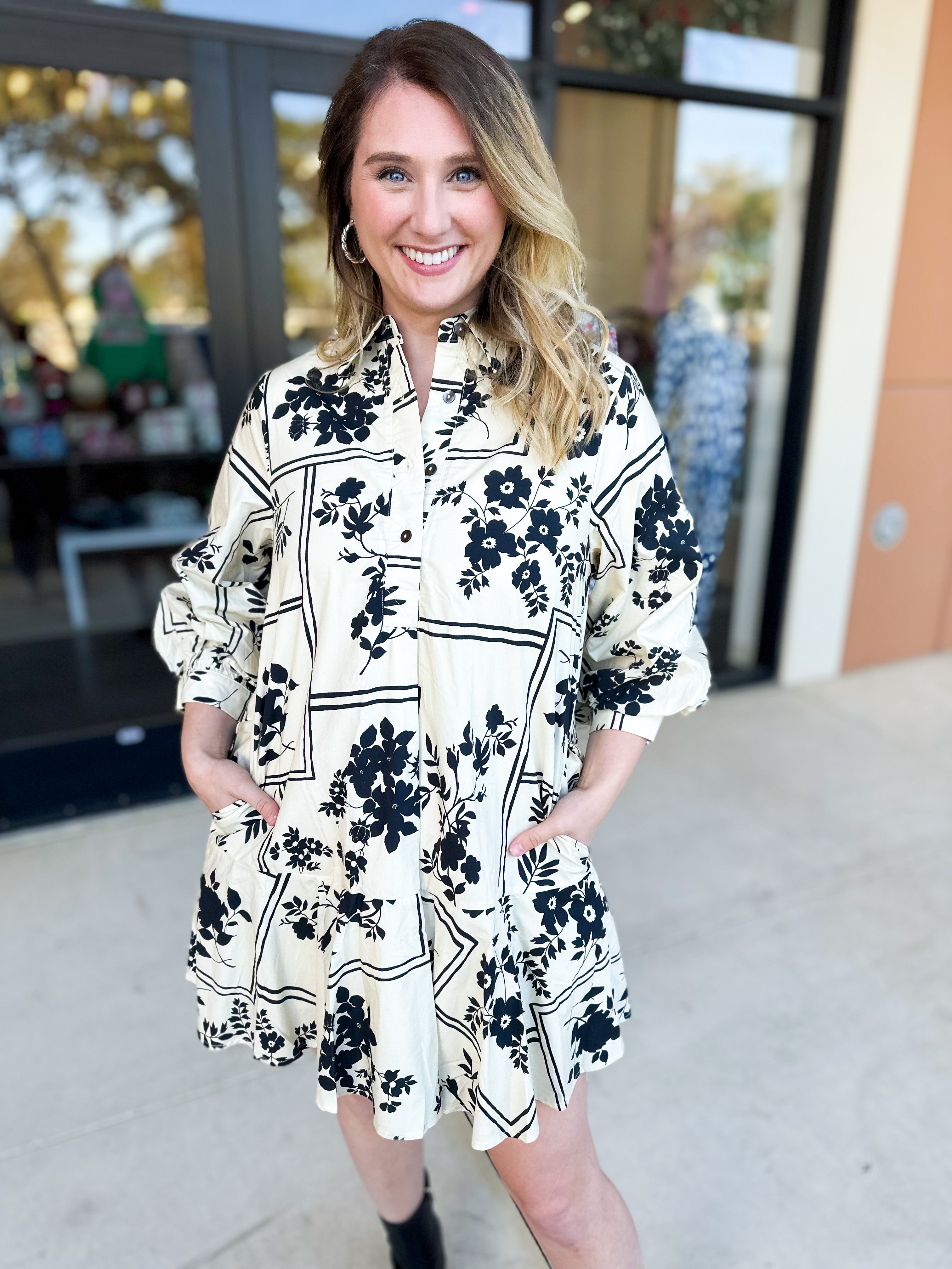 The Jolie Mini Dress in Black & Ivory brings an easy, elevated vibe with its bold print and effortless silhouette. It is perfect for days when you want to look put together without trying too hard. Throw it on with boots or sneakers for an instantly chic look!