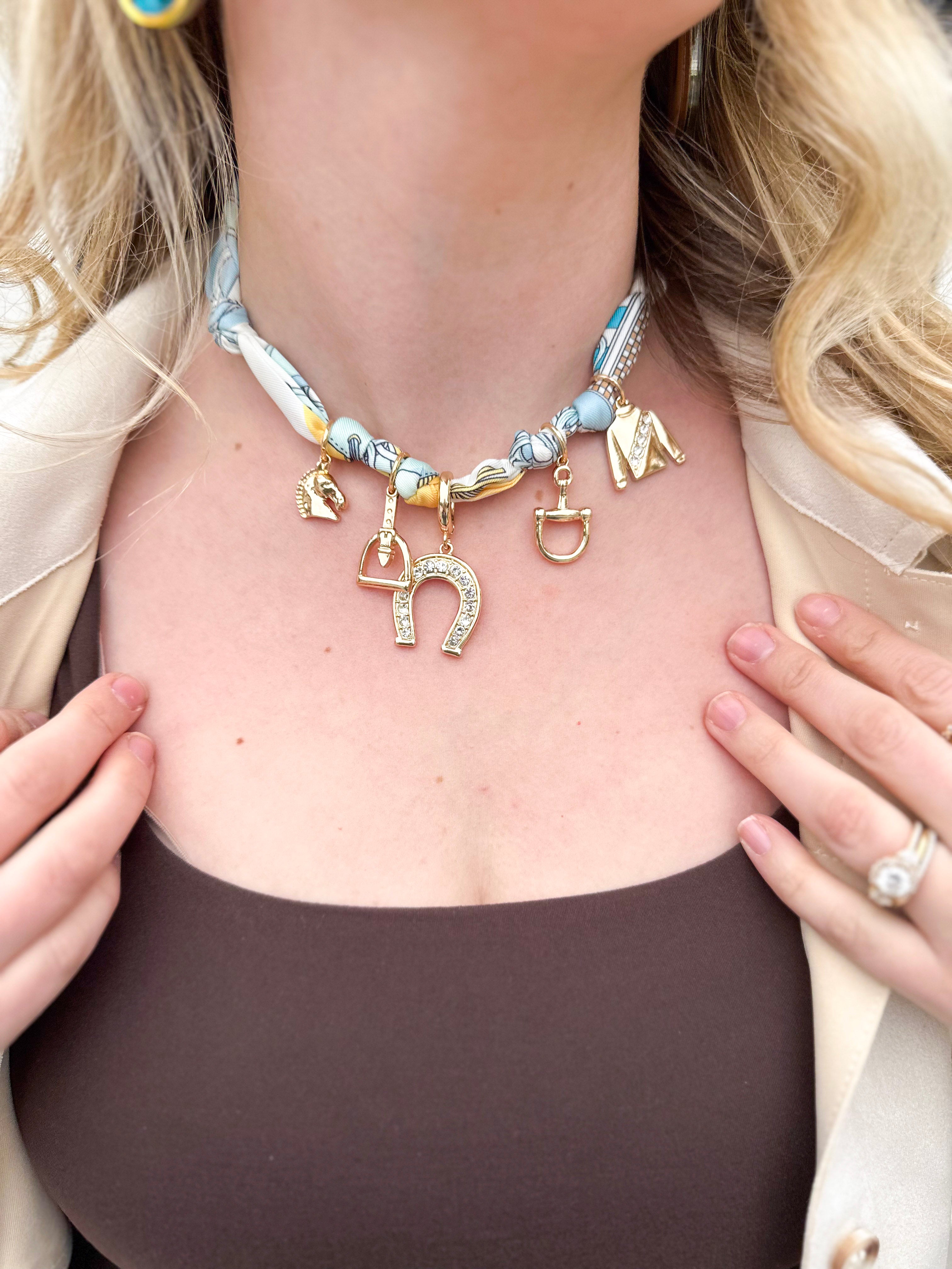 - Effortlessly graceful and endlessly versatile, the Steeplechase Scarf Necklace in Light Blue is a modern twist on timeless equestrian style. Crafted from a soft, flowing silk-blend fabric in a serene light blue, this scarf necklace is threaded through a polished gold-tone horsebit chain.