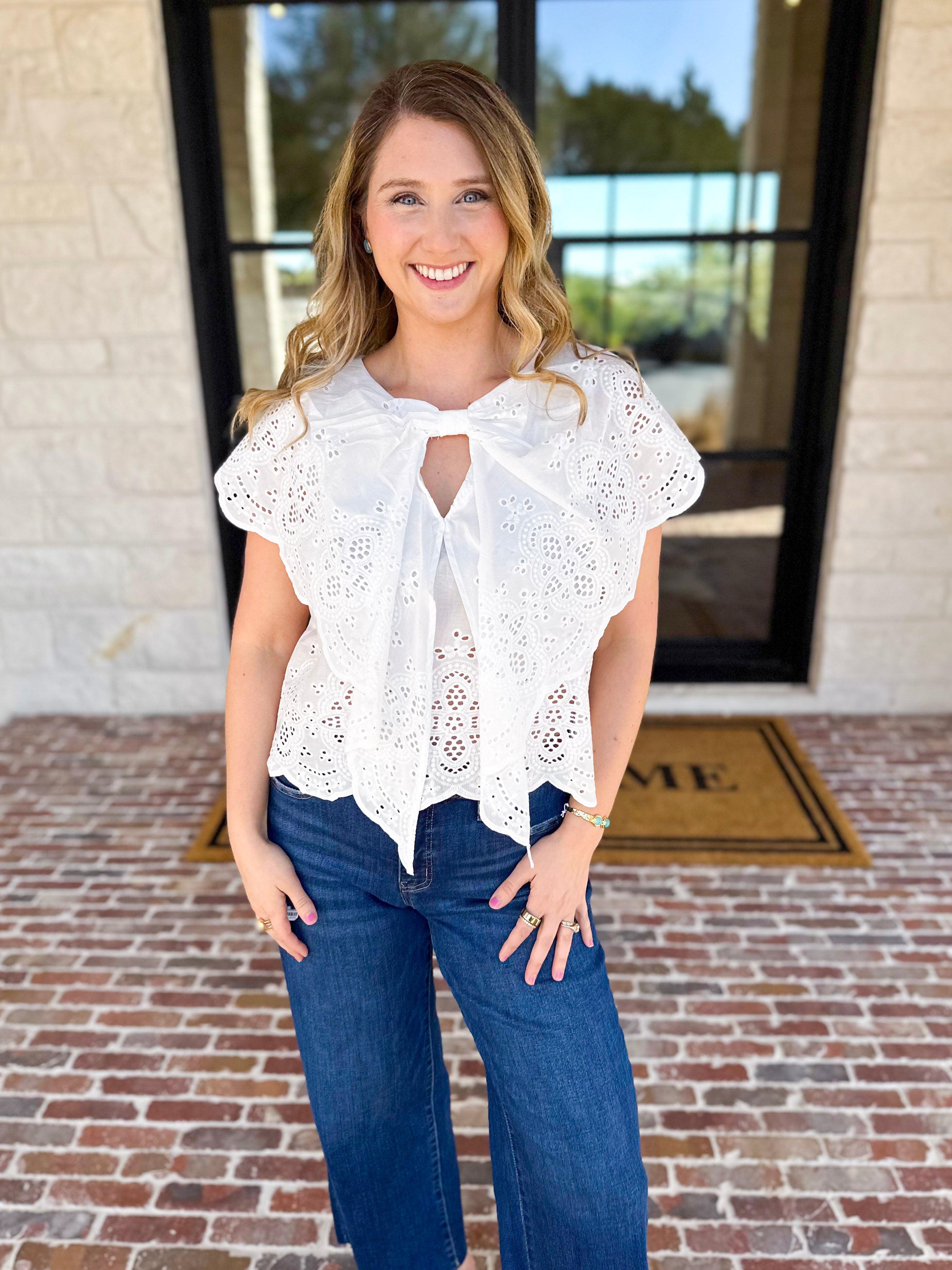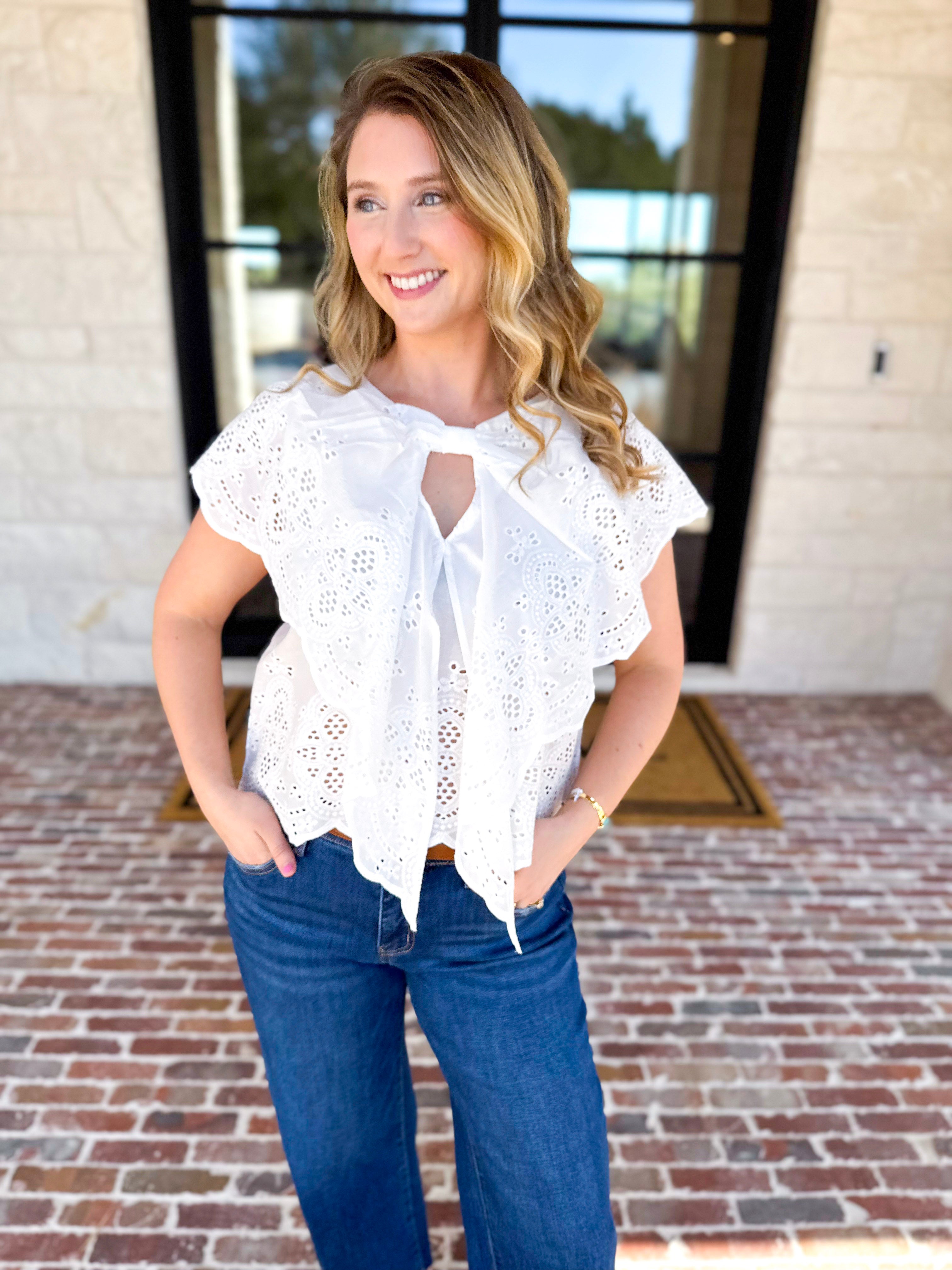 Soft, feminine, and endlessly versatile — the Ivory Eyelet Bow Front Blouse is a timeless piece with thoughtful details you’ll love. Perfect for Spring and Summer date nights or just for hanging out with friends!