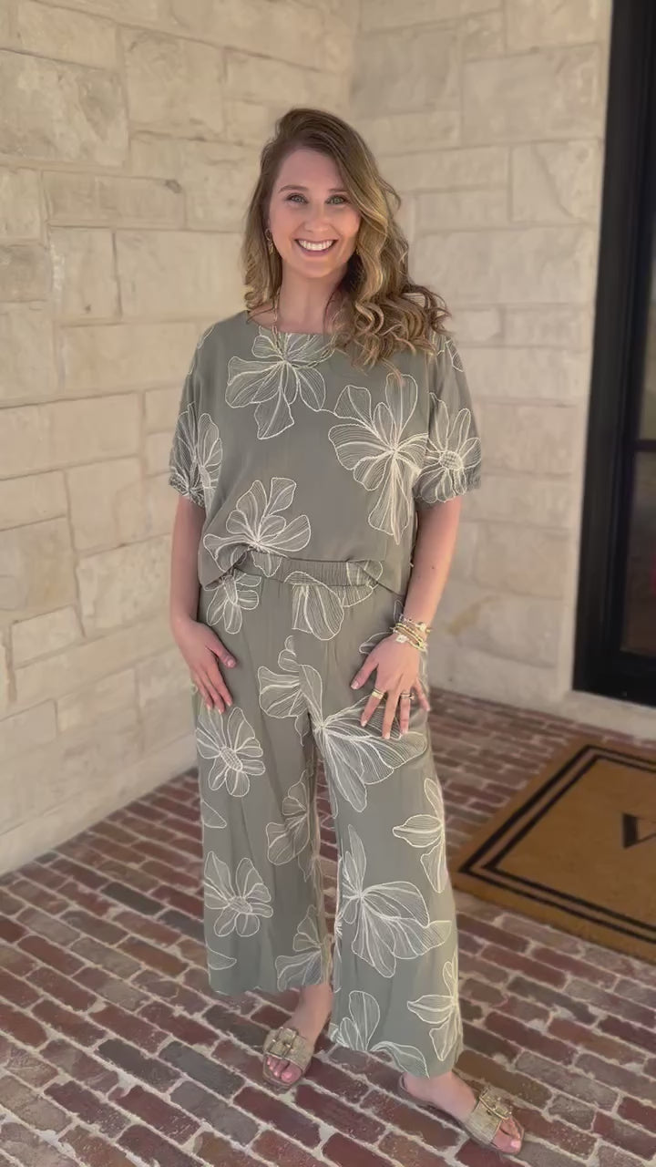 The Ivy Green Floral Pant Set combines comfort with style, featuring bold floral embroidery detail that elevates any look. Whether you're meeting friends for lunch or packing for your next getaway, the breathable fabric and versatile design make it an effortless choice for warm-weather adventures!