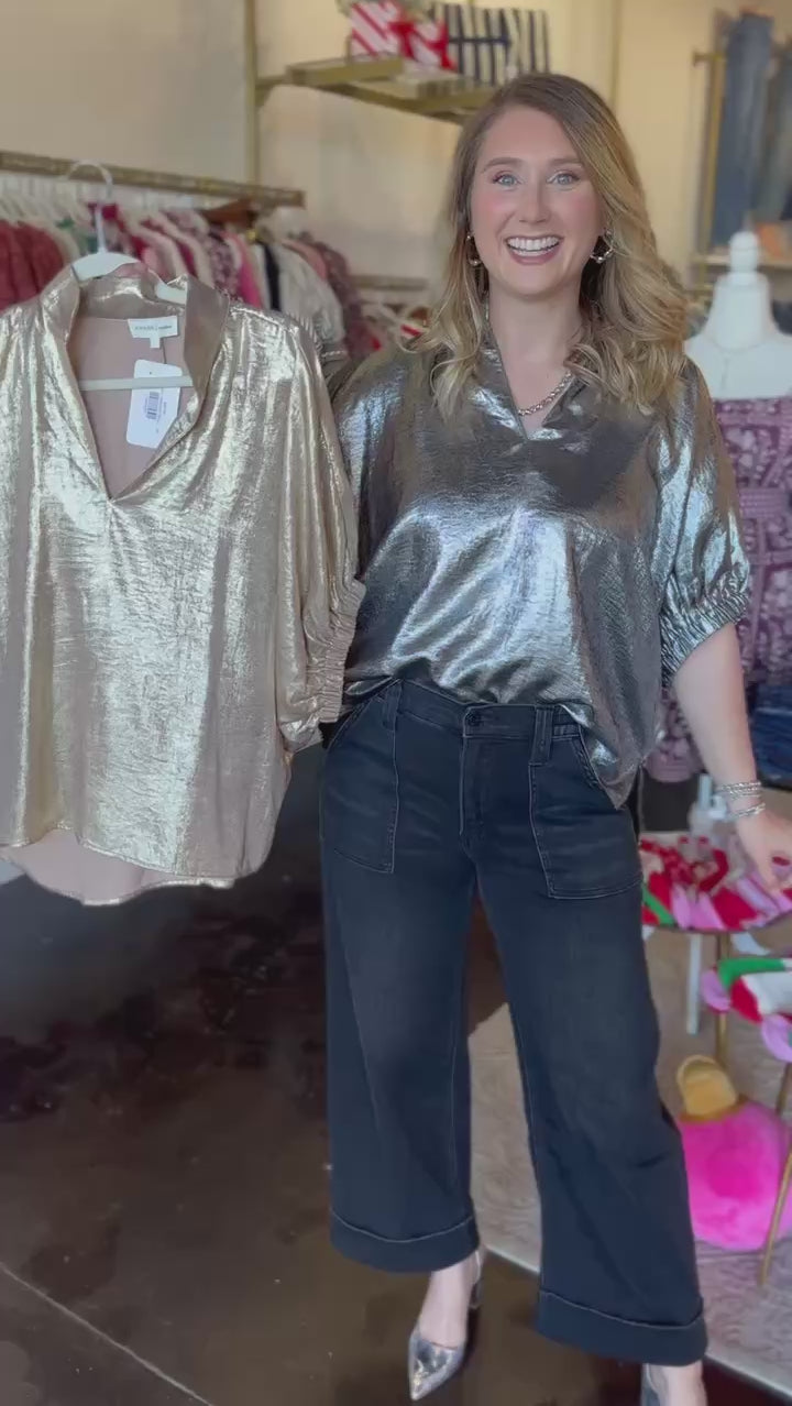 Elevate your look with the Celebration Blouse in Chrome and Gold! Its lightweight fabric and flattering fit make it perfect for date nights or festive holiday parties, bringing effortless charm and fun to your wardrobe! Be the star of the show with this metallic cutie!