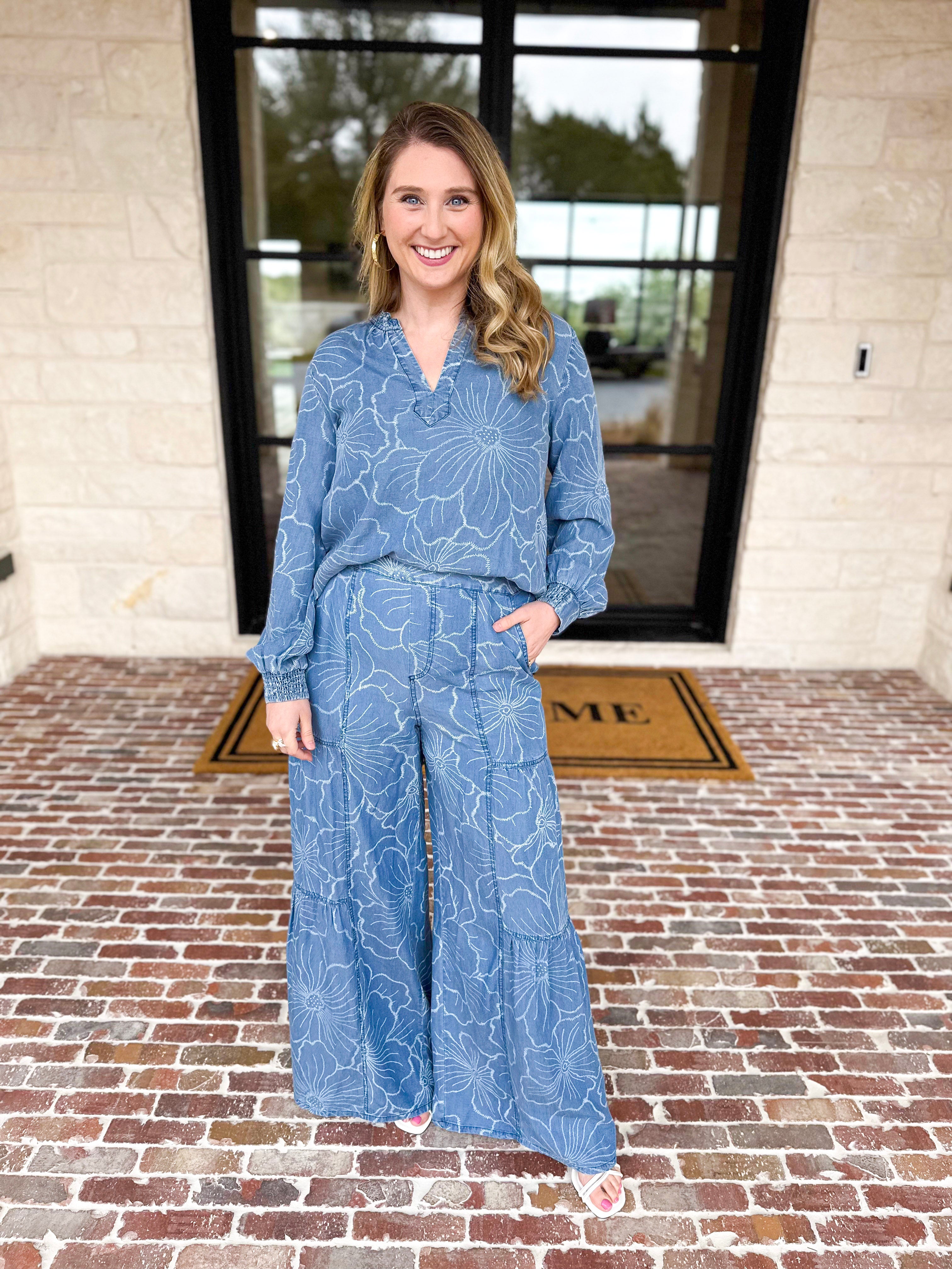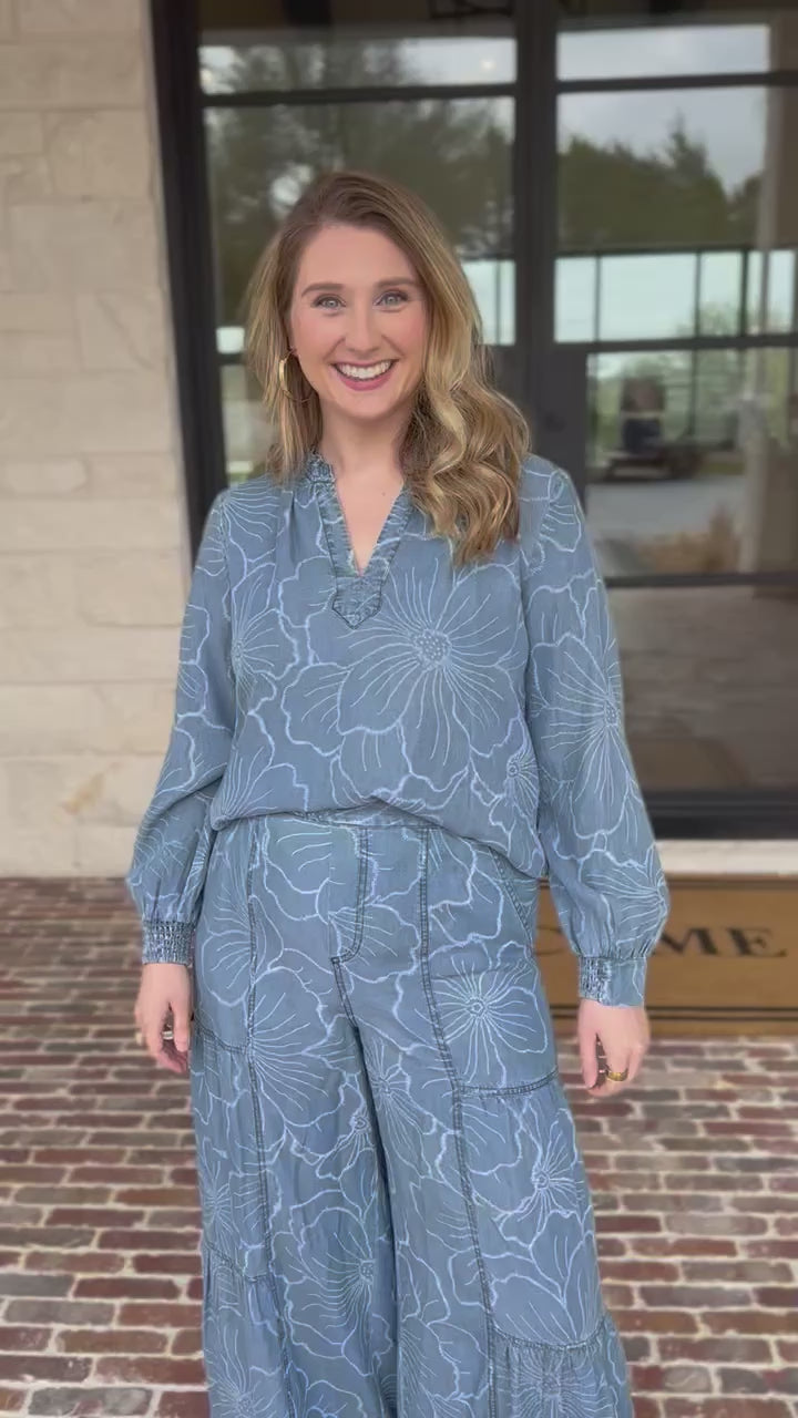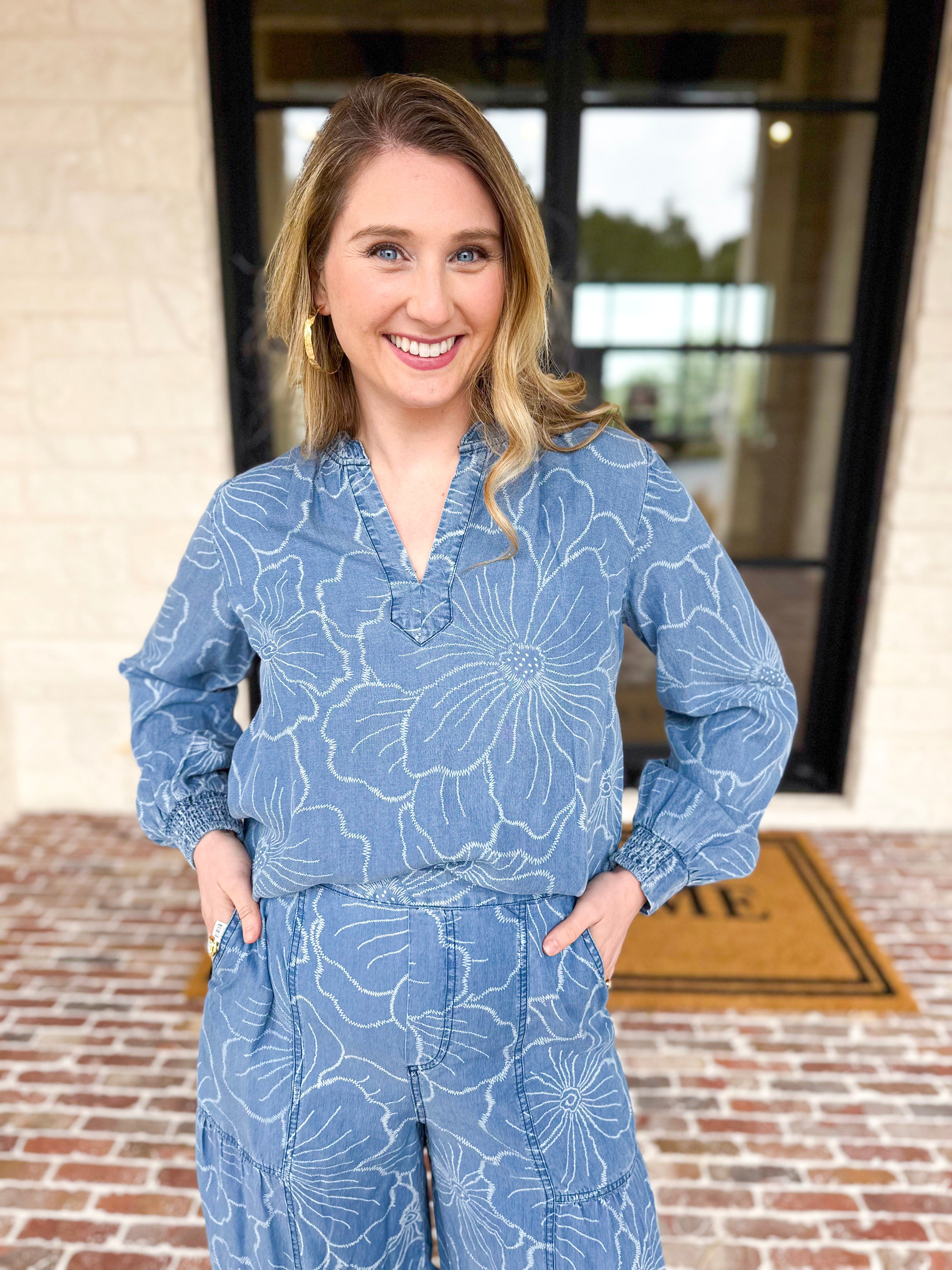 Crafted from lightweight denim chambray, this floral blouse transitions seamlessly from casual weekend wear to dressed-up occasions. The relaxed silhouette and breathable fabric make it ideal for spring days and vacation getaways!
