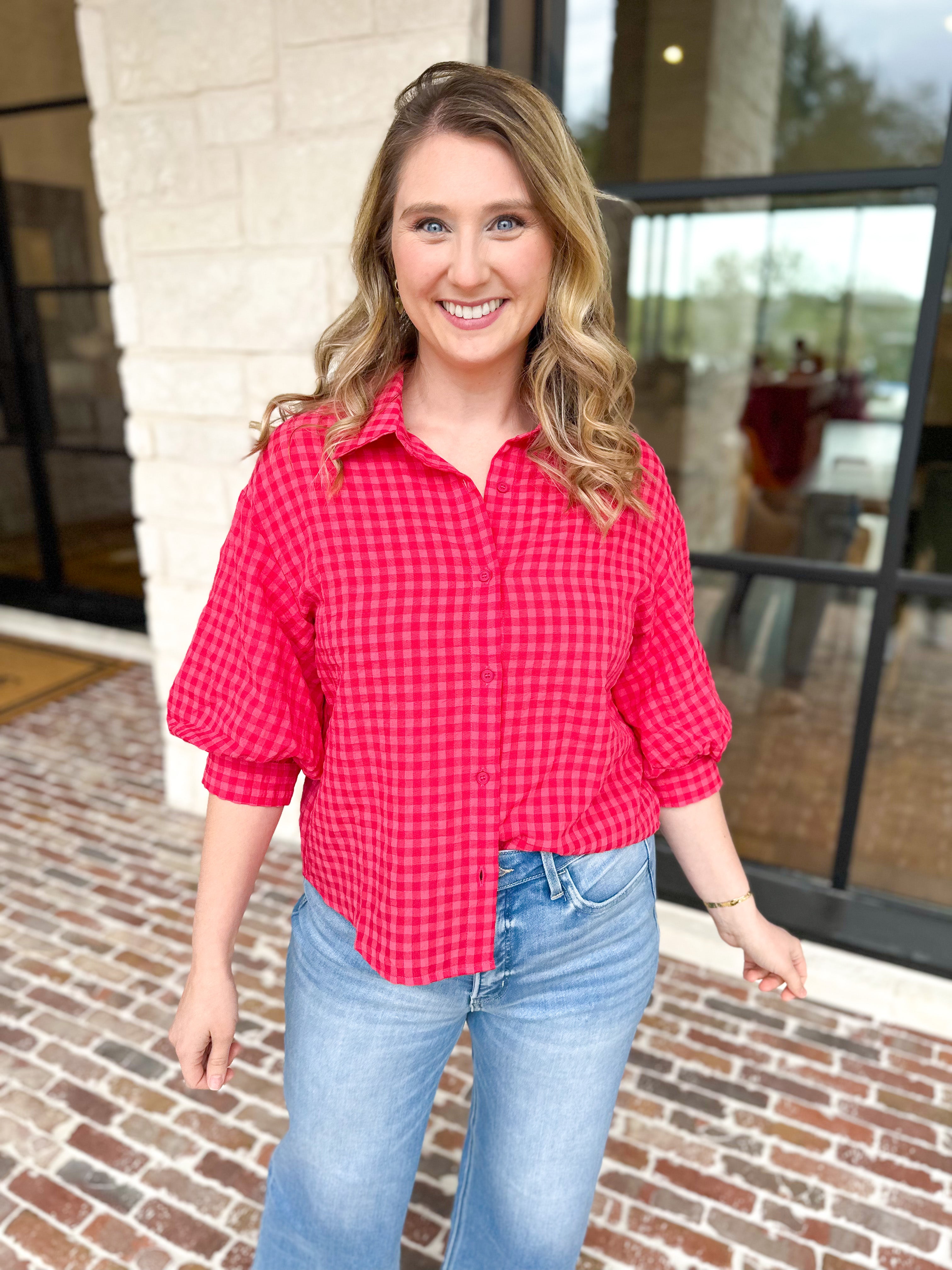 Make a statement in the vibrant Red & Pink Gingham Button Down Top that brings playful energy to any outfit. The bold checkered print pops with color, while billowing sleeves add an effortless style. This piece is fun, flirty, and undeniably chic!
