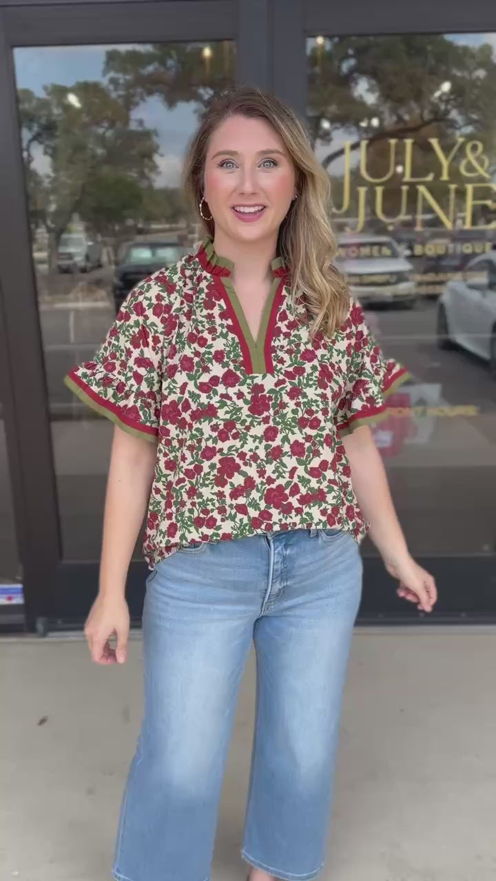 This burgundy and olive floral blouse captures the essence of fall with its rich, warm tones. Style it casually with jeans or dress it up for a night out—the versatile print and flattering cut work for any occasion!