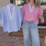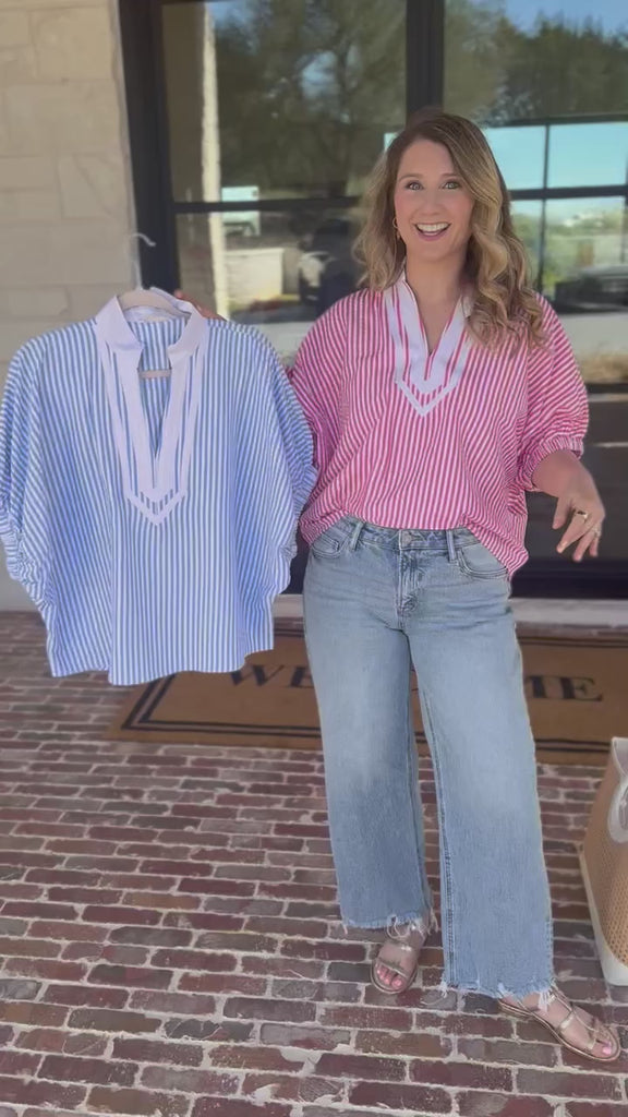 Get ready to fall in love with a customer favorite that we have brought back in a new print! The Seersucker Sweet Blouse in Light Blue and Pink will be your new fav top! Easy and effortless that you can style in your own way!