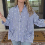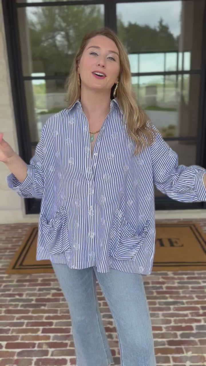 Meet your new go-to – The Seashell Flow Button Down Blouse. This button-down features a charming seashell embroidered detail that brings subtle coastal vibes to any outfit. The relaxed fit and fabric make it ideal for throwing on with jeans, linen pants, or shorts—no fuss required!