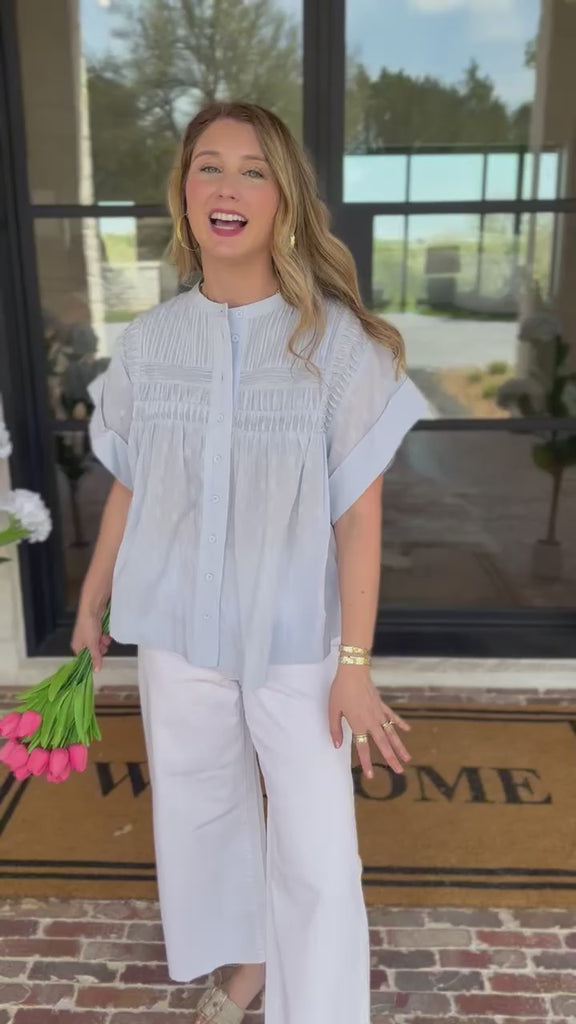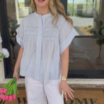 Add some feminine flair to your wardrobe with our Sweet Blue Blouse. This trendy top features lightweight textured fabric and a flowy fit, perfect for any occasion. Stay stylish with ease! Easy to dress up or keep it more simple for a causal gathering with friends!
