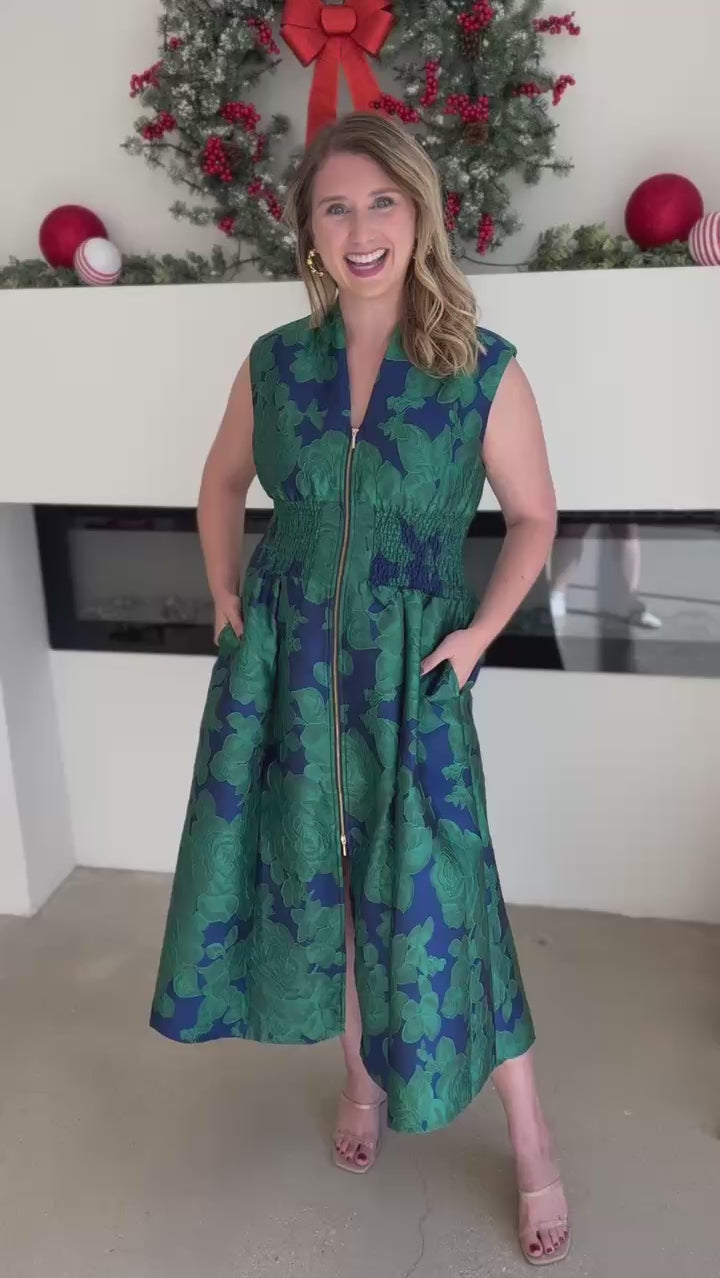 Our Teal & Bold Blue Midi Dress features a unique and gorgeous brocade floral fabric that brings elegance to any celebration. The flattering silhouette enhances your figure with ease, while feminine details add just the right touch for any special occasion or holiday party!