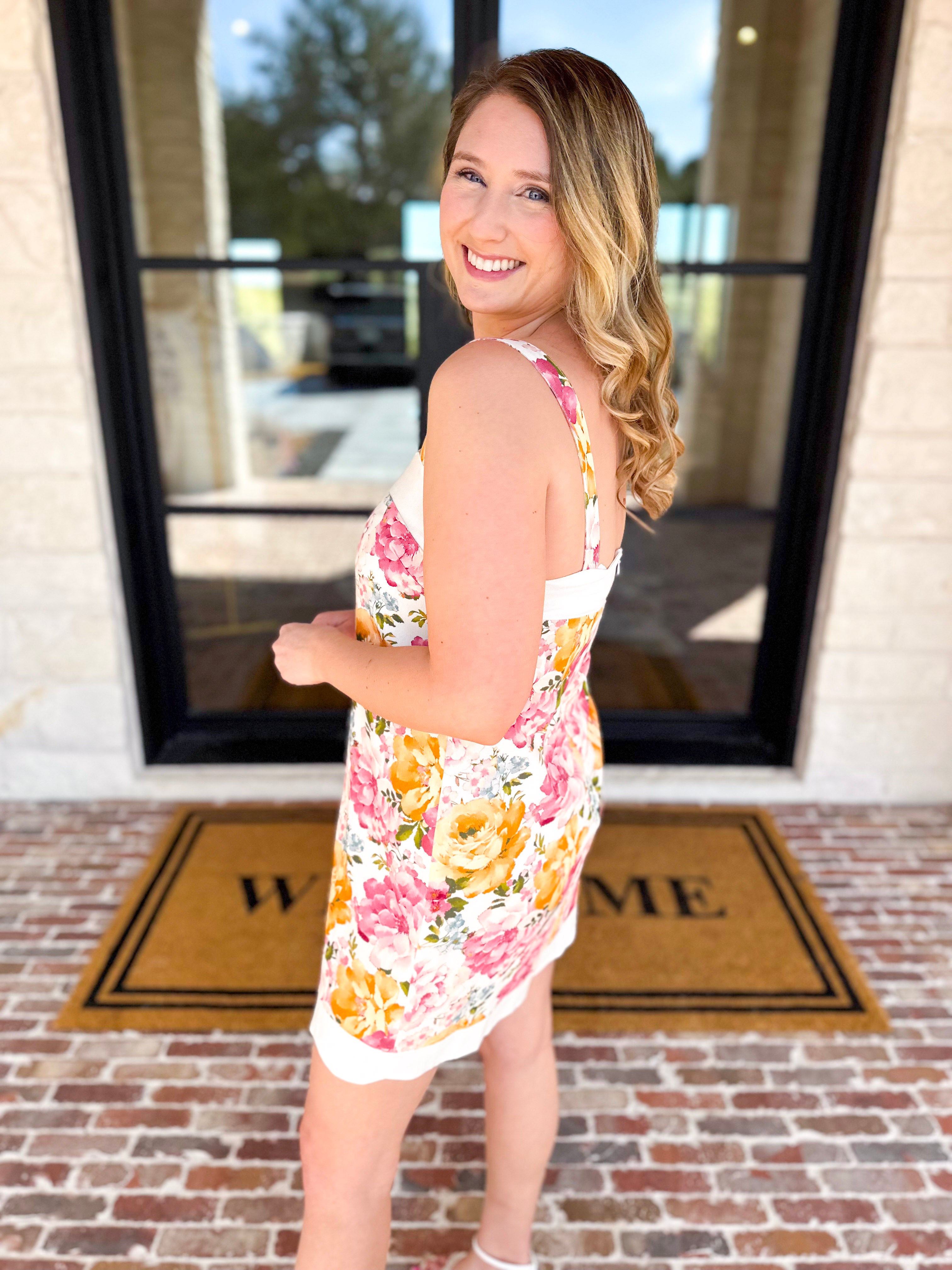 Fresh, feminine, and full of charm, the Cream & Floral Scalloped Mini Dress is made for sunshine and sweet celebrations. Featuring a cream base with vibrant florals and colors, this dress feels both classic and playful and sexy at the same time. Perfect for a summer date night or your next vacation!