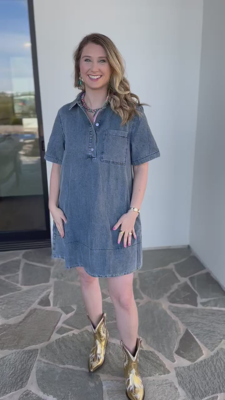 Meet your new go-to piece. This adorable denim mini dress works with everything in your closet—throw it on with cowboy boots for a western edge or pair it with sneakers for pure casual comfort. The vintage wash adds character while the simple cut lets you style it however you want. Dress it up, dress it down, make it yours!