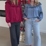 This Satin Ruffle Blouse combines lightweight luxe satin with delicate ruffle details for a flowy, effortless look. Its soft drape enhances comfort and style, making it perfect for an easy and elegant outfit for the holiday season!