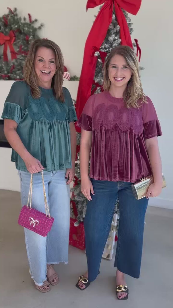 Add some feminine flair to your wardrobe with our Lace Details Velvet Blouse. This trendy top features delicate lace accents and soft velvet material, perfect for the winter and holiday season!