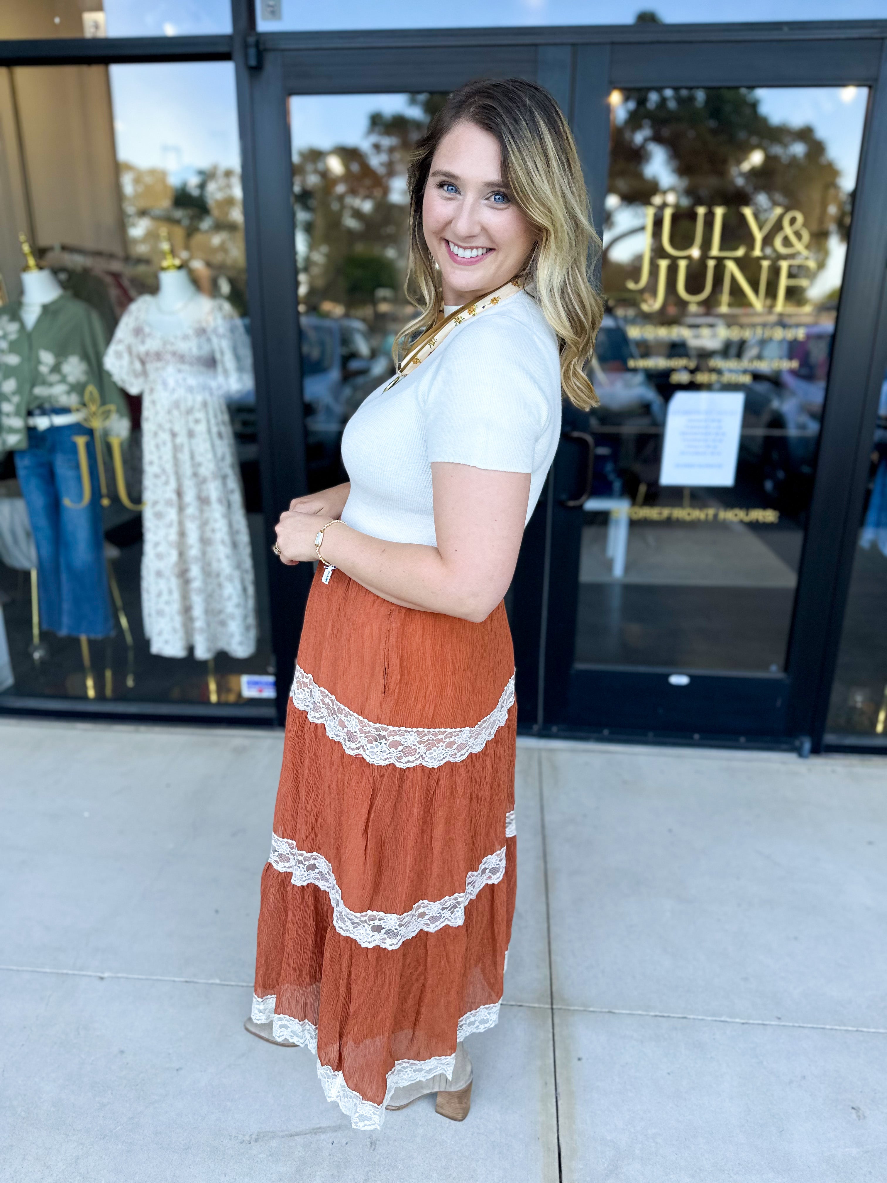 The Rust Lace Midi Skirt captures the essence of classic fall with its rich, warm color and delicate lace detailing. Lightweight and comfortable, it offers an effortlessly chic look that transitions seamlessly from day to night!