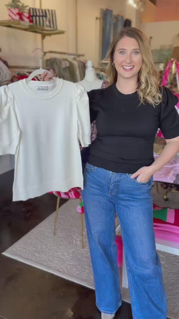 Elevate your everyday wardrobe with the Chic Short Sleeve Sweater Top in classic black or Ivory. Featuring charming puff sleeves that add a touch of feminine flair, this piece effortlessly transitions from casual days to polished evenings. A true closet essential!