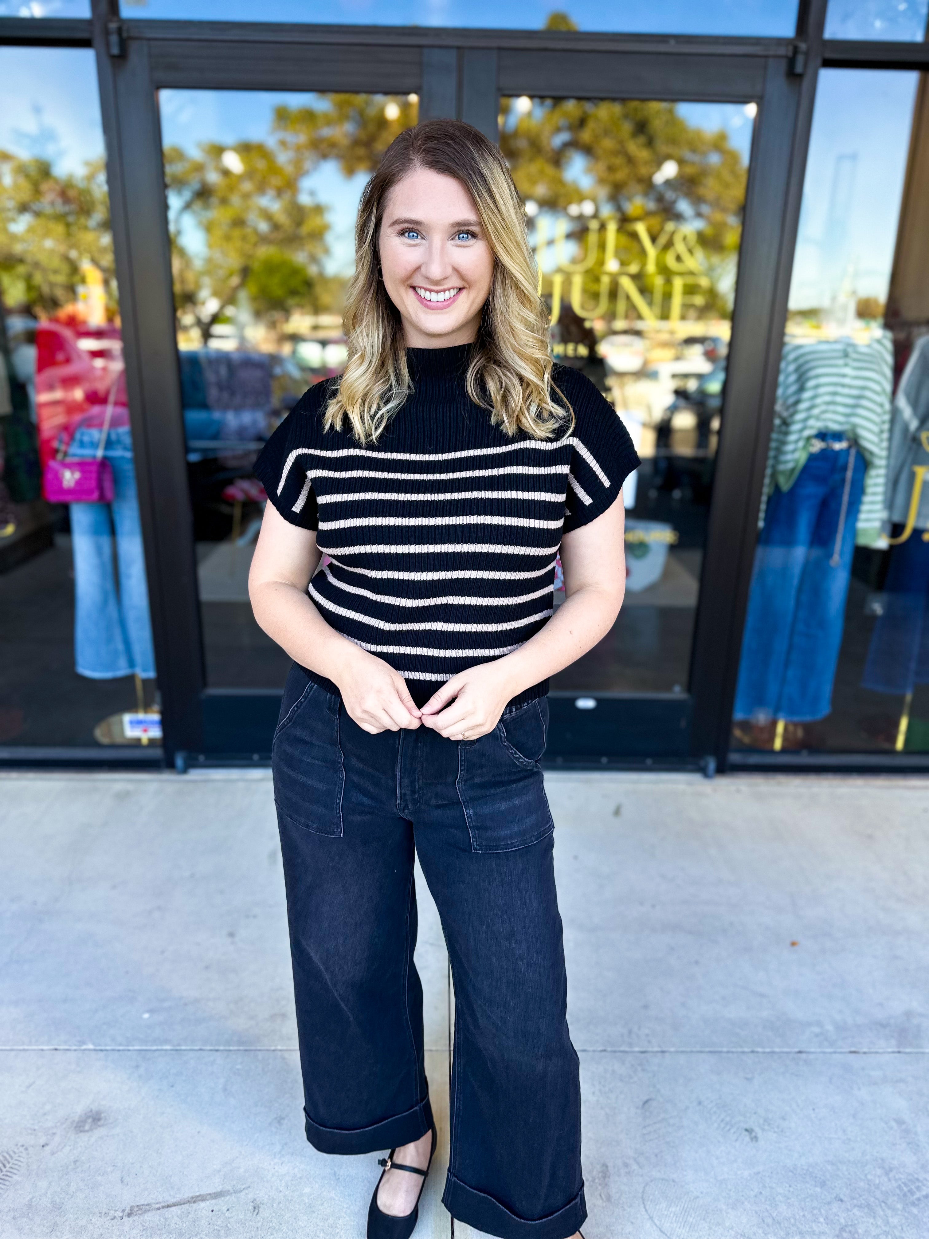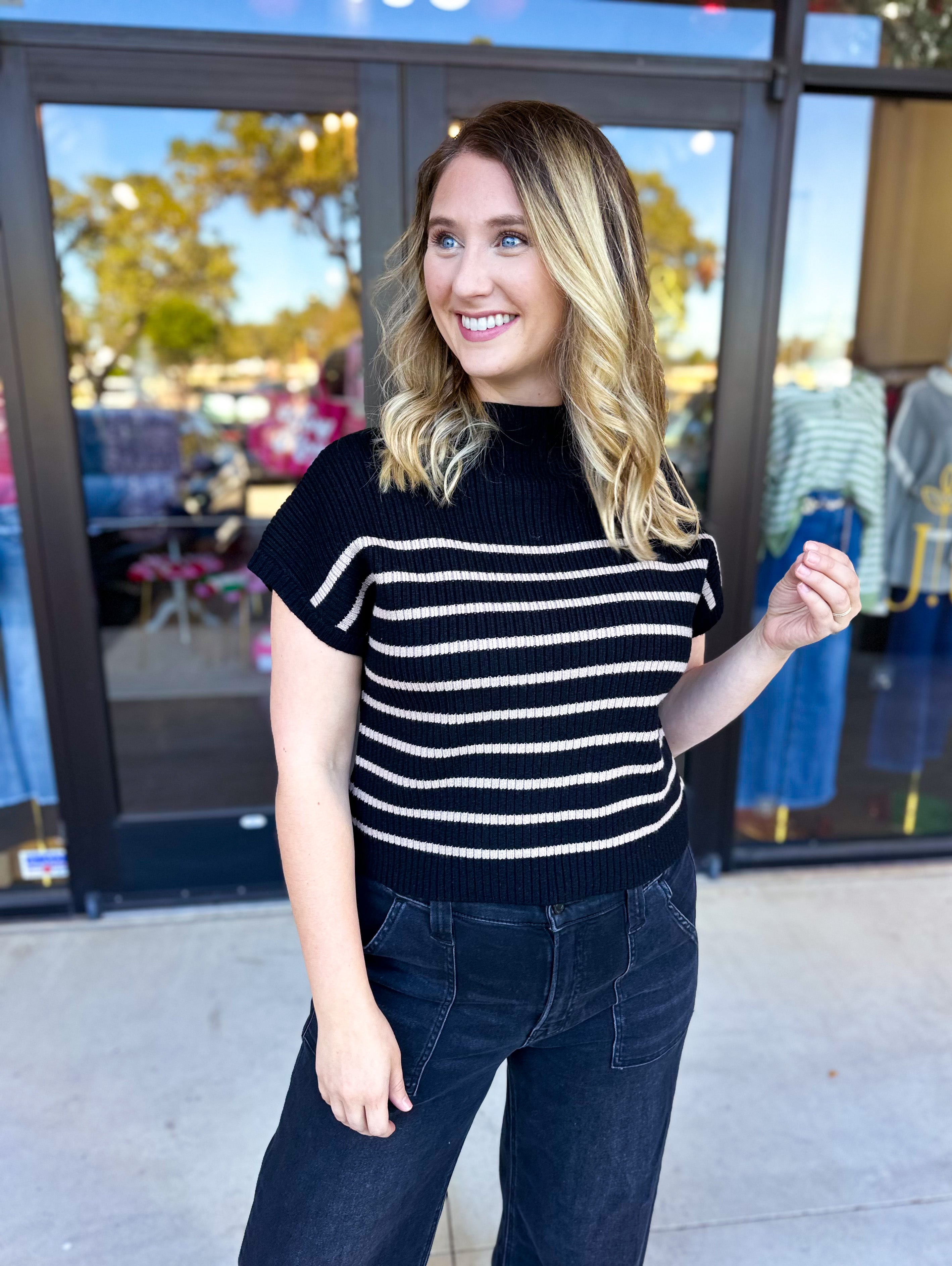 Embrace cozy warmth with the Mock Neck Knit Sweater Top. Its soft fabric makes it ideal for comfort while still looking cute! A winter casual must have! Stripes is such a classic print that you can never go wrong with!