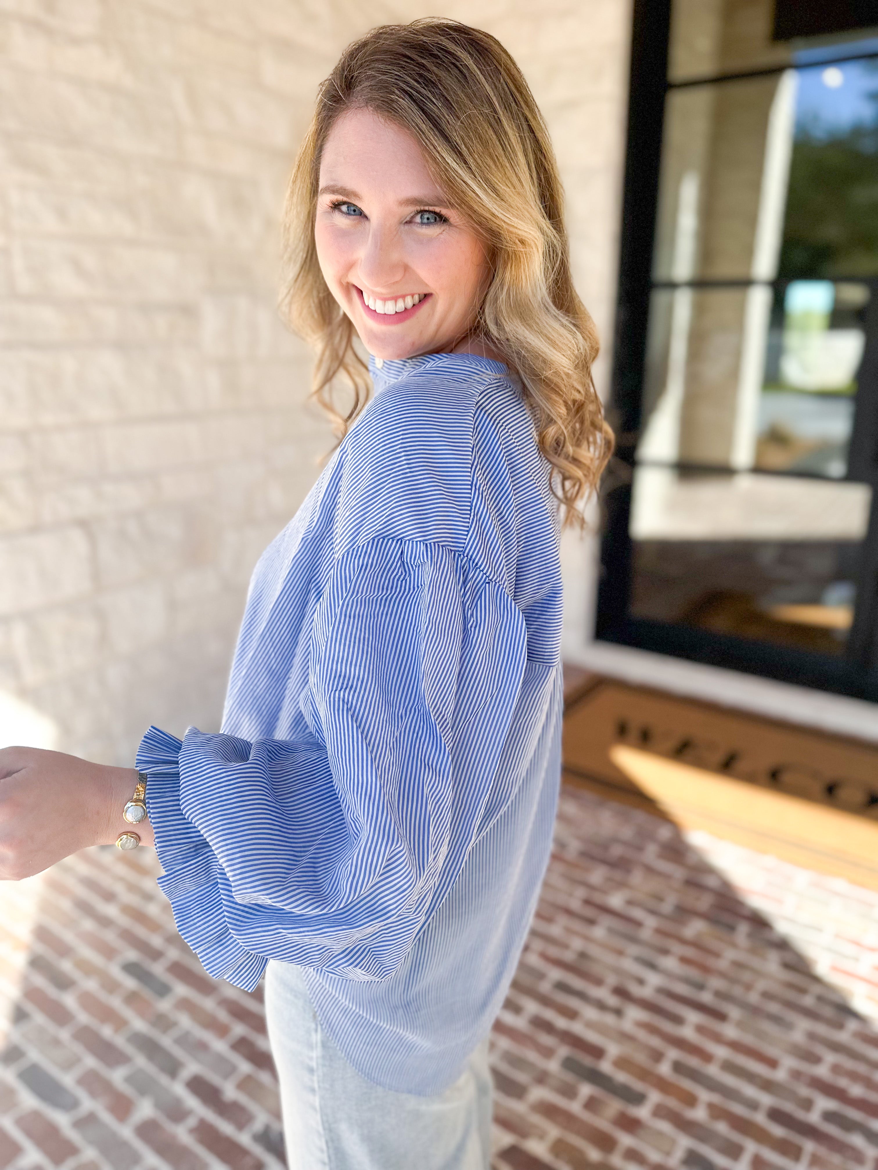 Introducing your new favorite everyday blouse – The Pinstripe Bubble Sleeve Blouse! Lightweight and easy to wear, this versatile blouse is the perfect choice for your everyday wardrobe. Say goodbye to the hassle of picking out outfits each day - this blouse has you covered!