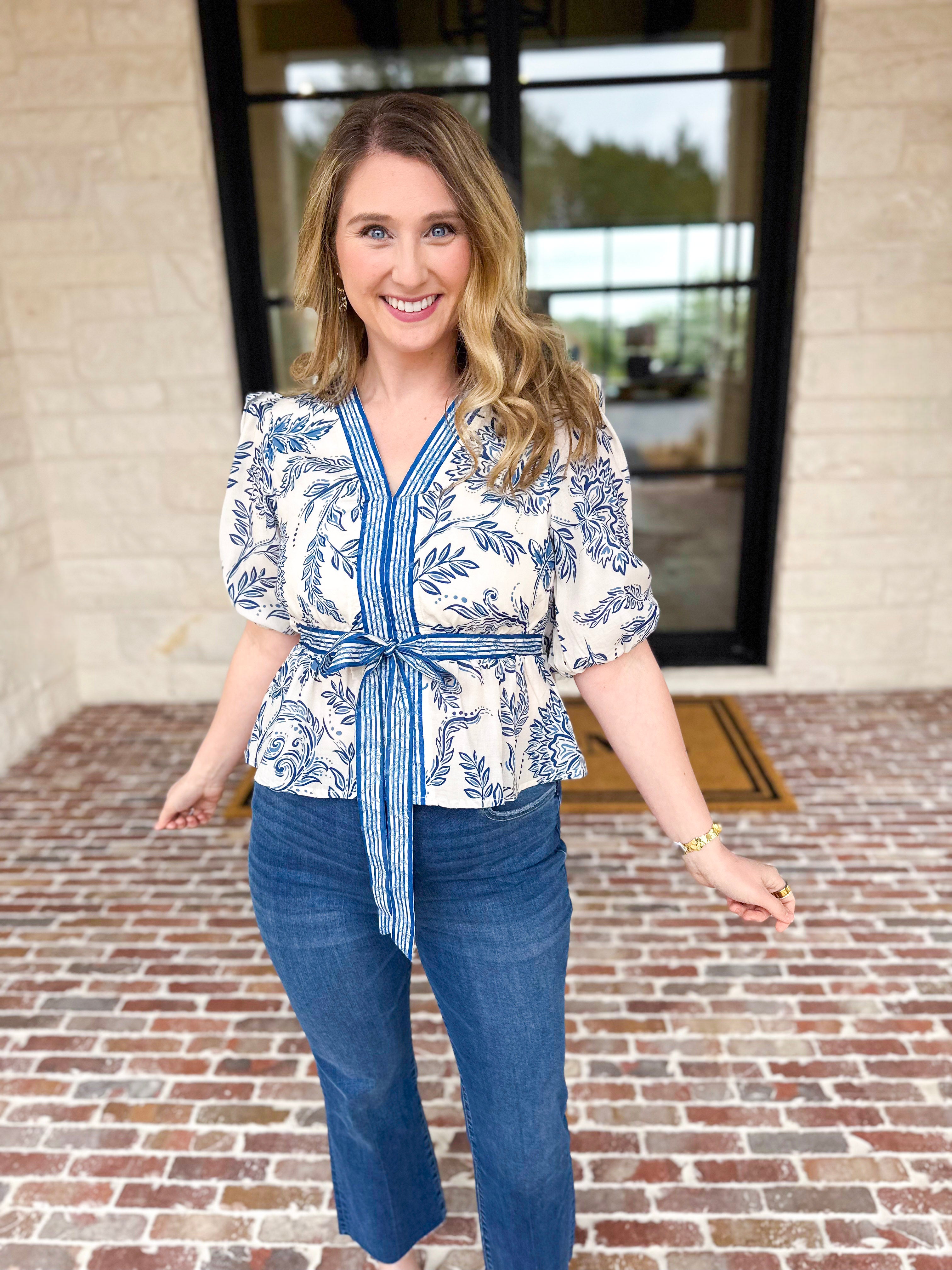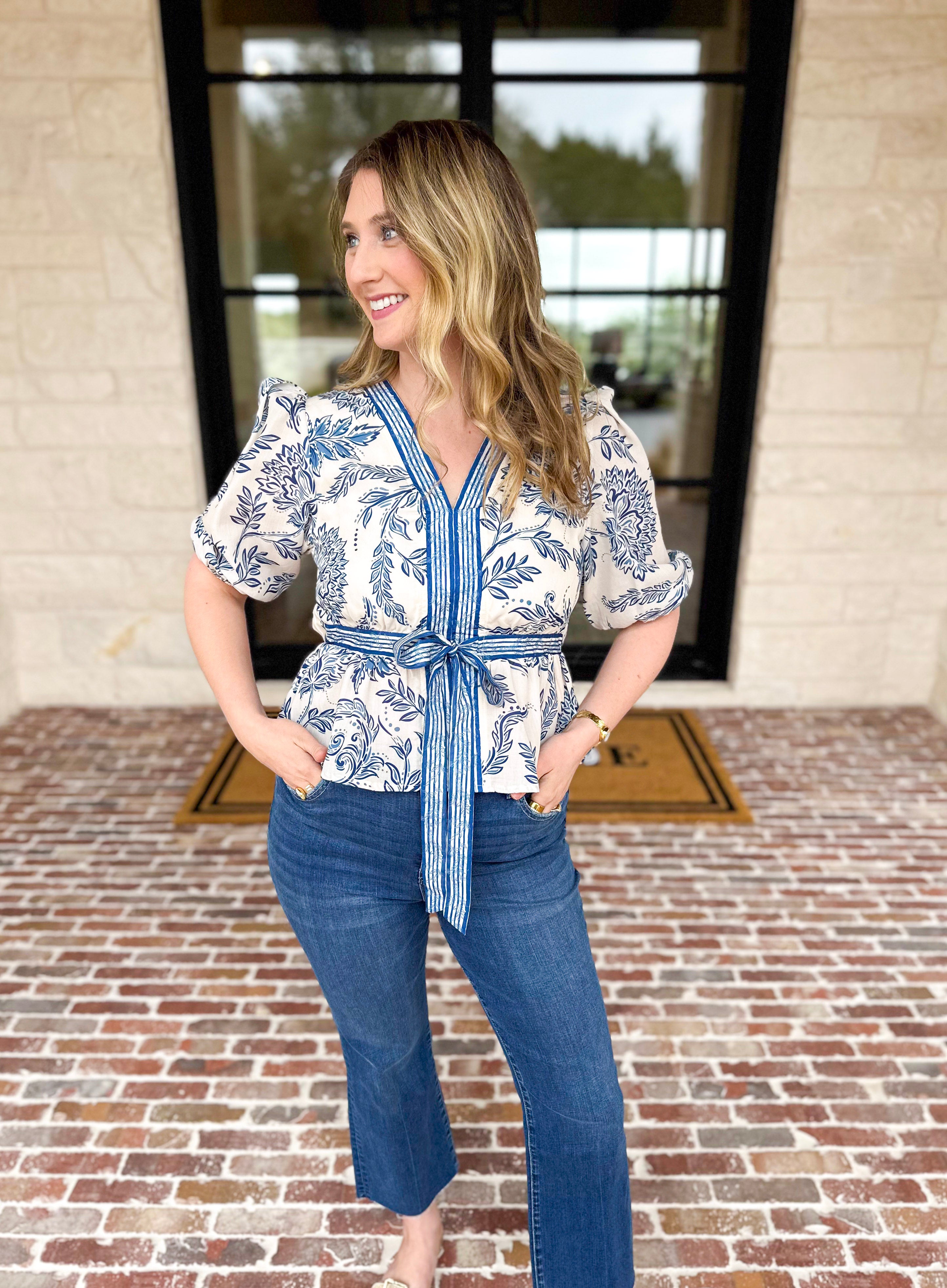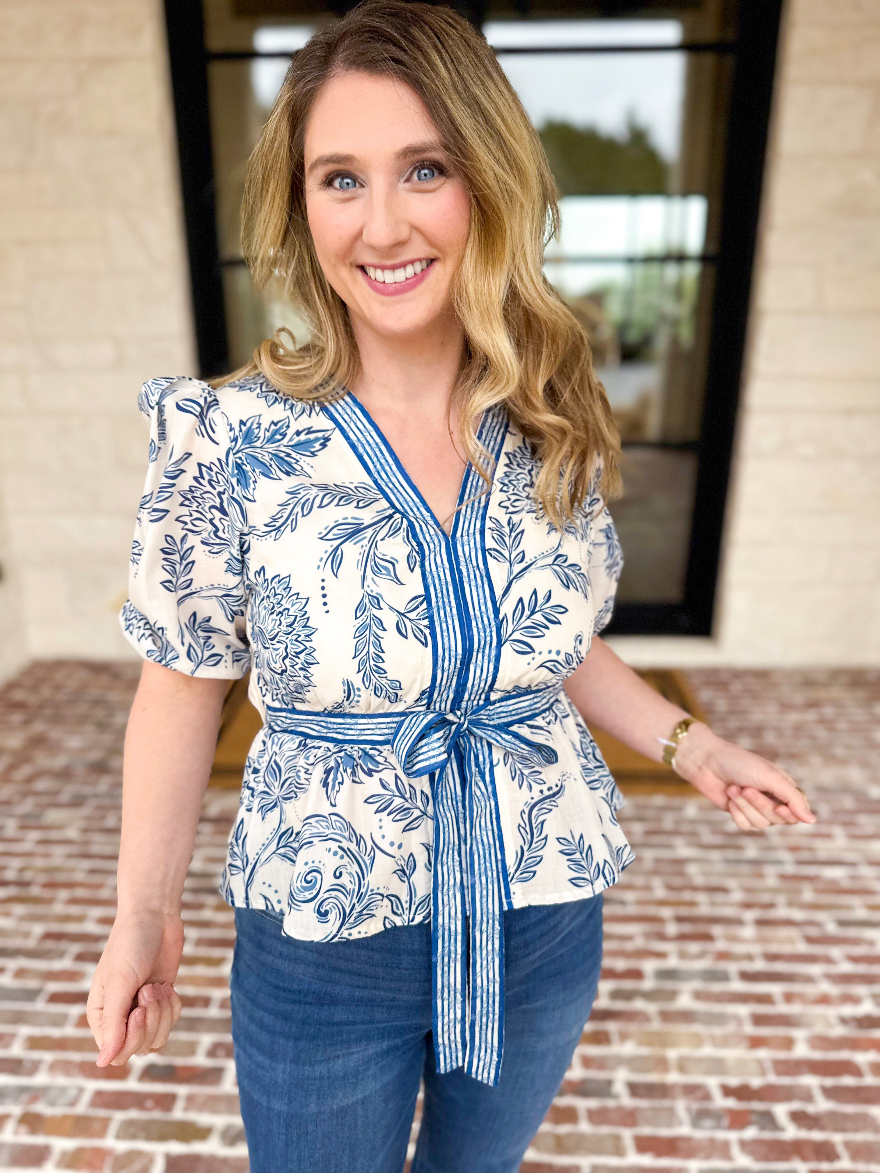 Soft spring florals meet timeless elegance in this feminine blouse. The classic blue and ivory palette brings a fresh, coastal-inspired look that pairs seamlessly with your everyday pieces. Designed with delicate details and an effortless vibe, it's a wardrobe essential for the season ahead!