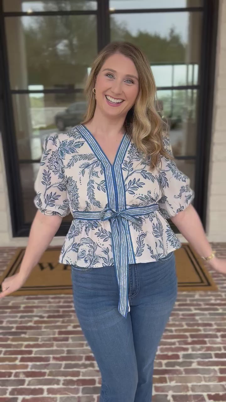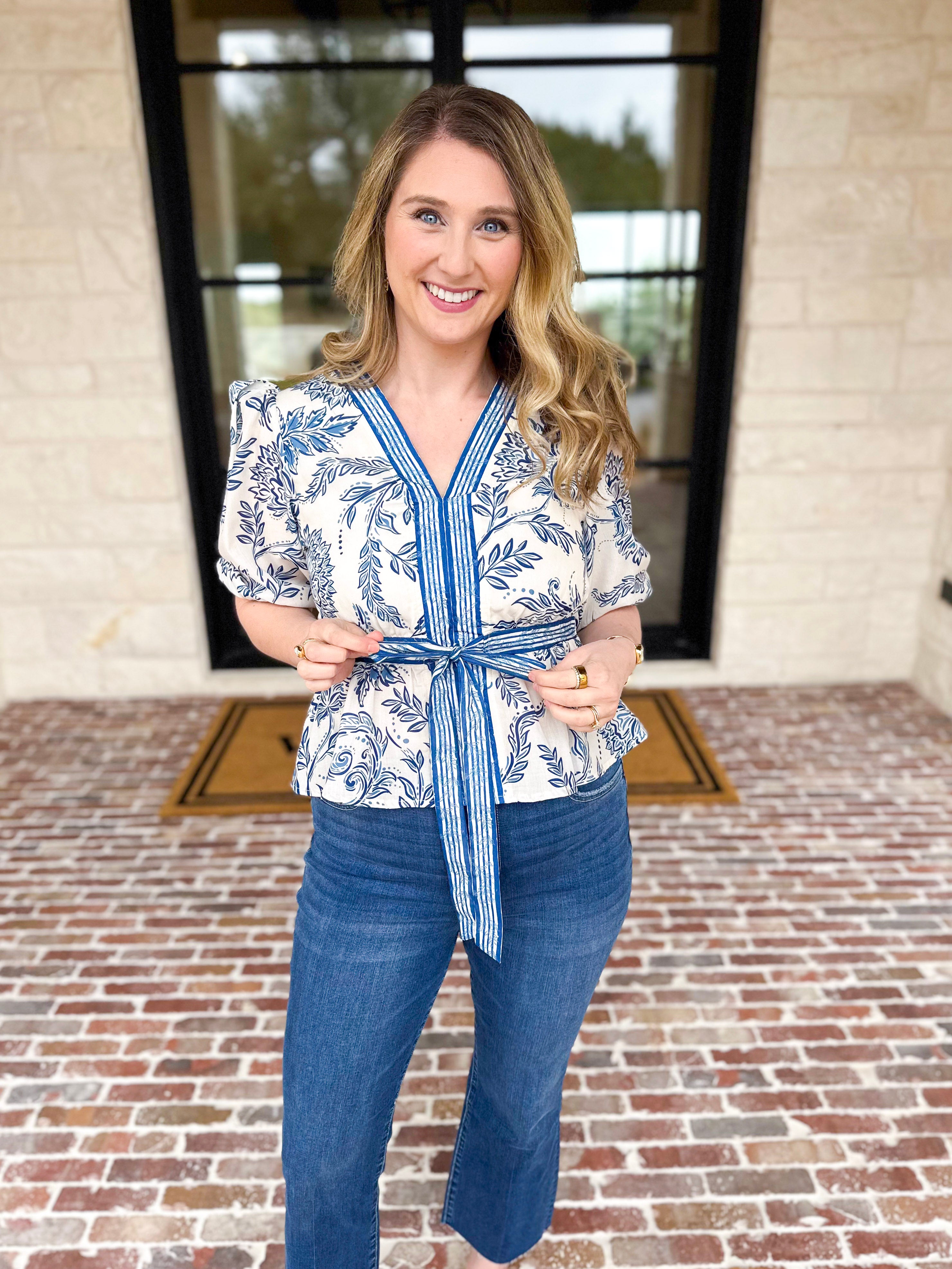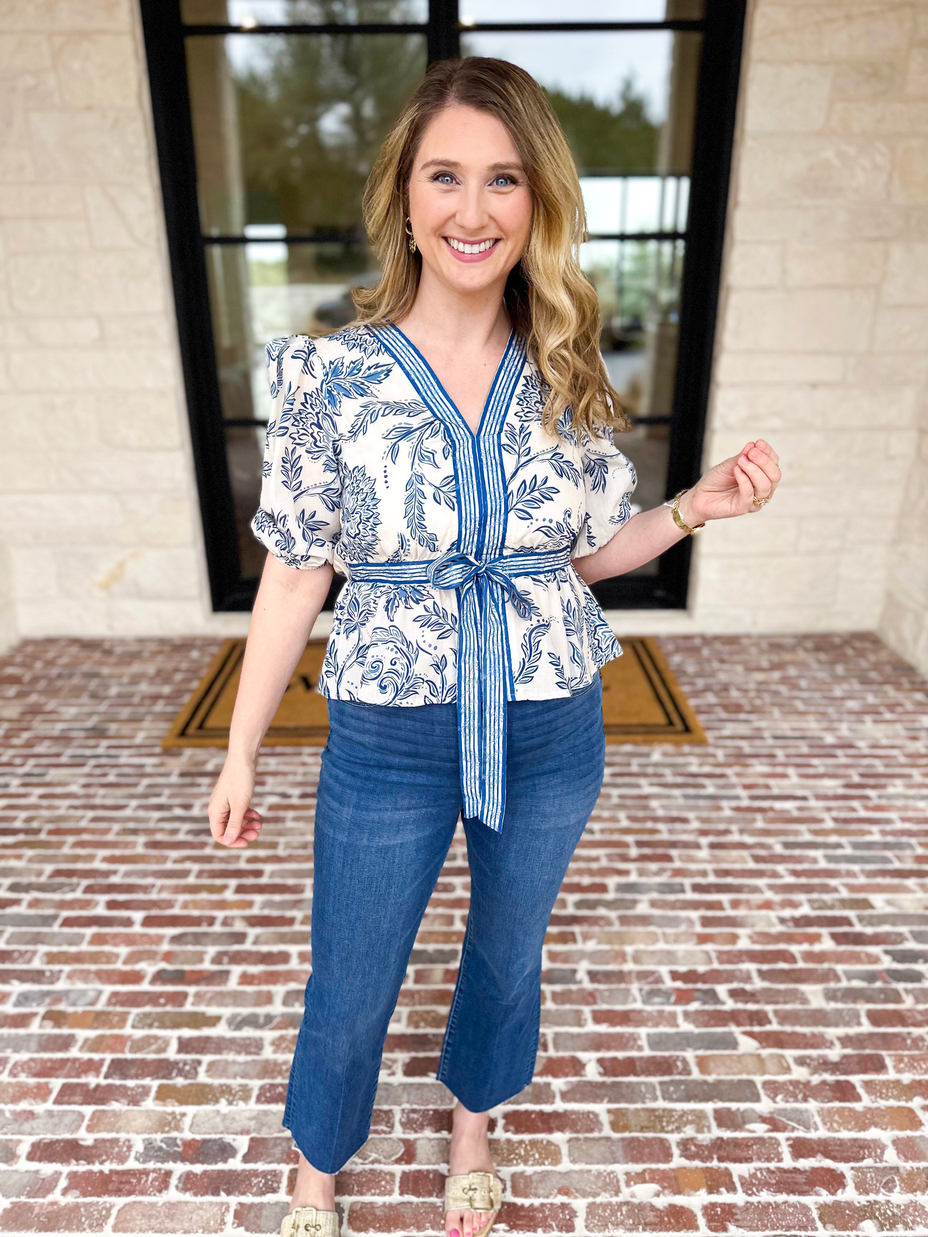 Soft spring florals meet timeless elegance in this feminine blouse. The classic blue and ivory palette brings a fresh, coastal-inspired look that pairs seamlessly with your everyday pieces. Designed with delicate details and an effortless vibe, it's a wardrobe essential for the season ahead!