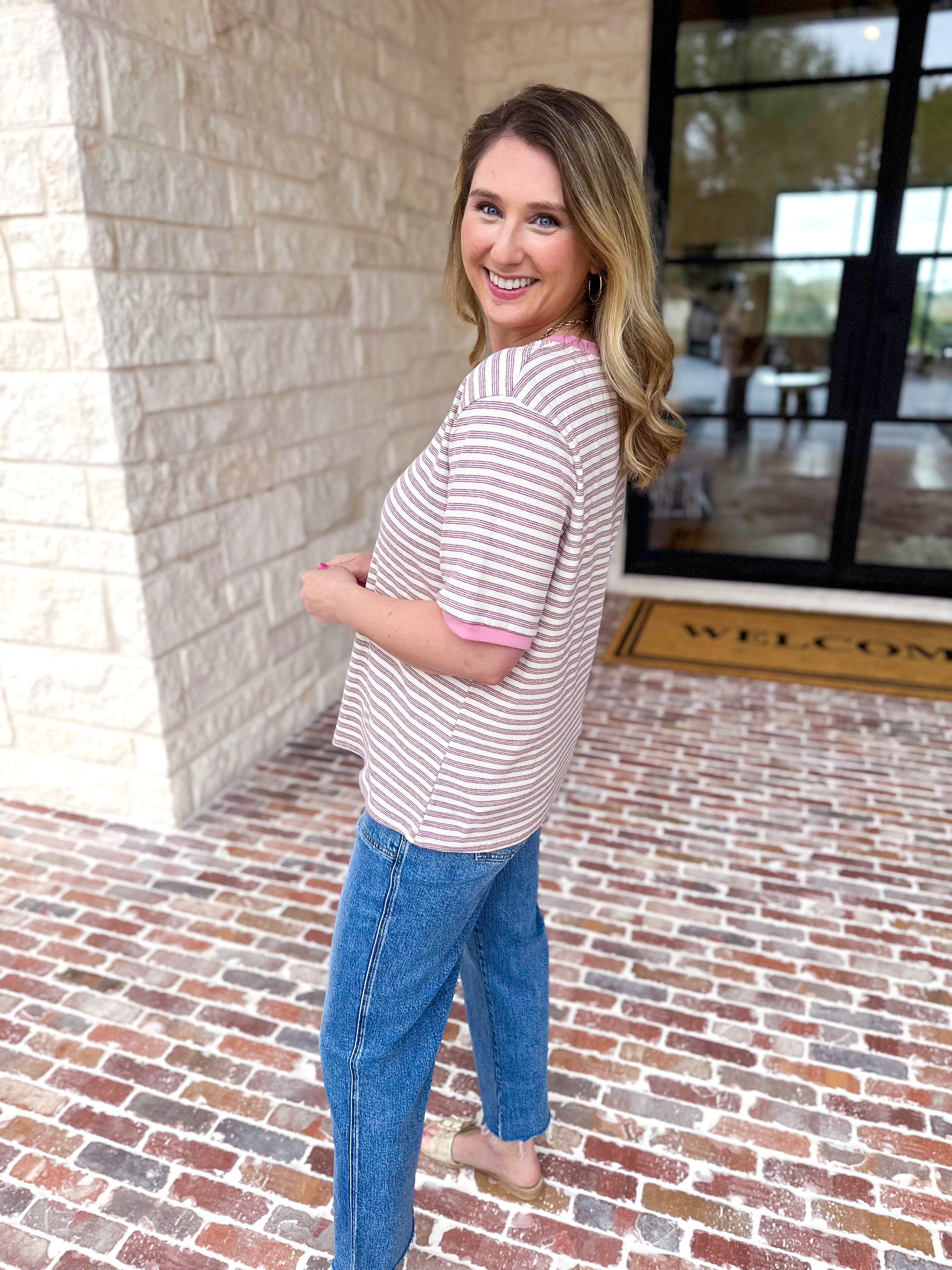 Throw on the Casual Hangout Striped Tee for those laid-back moments where comfort meets style. The classic stripes work with everything in your closet, making it your go-to piece for casual hangouts, errands, or just living your day. Easy, breezy, and always in rotation!