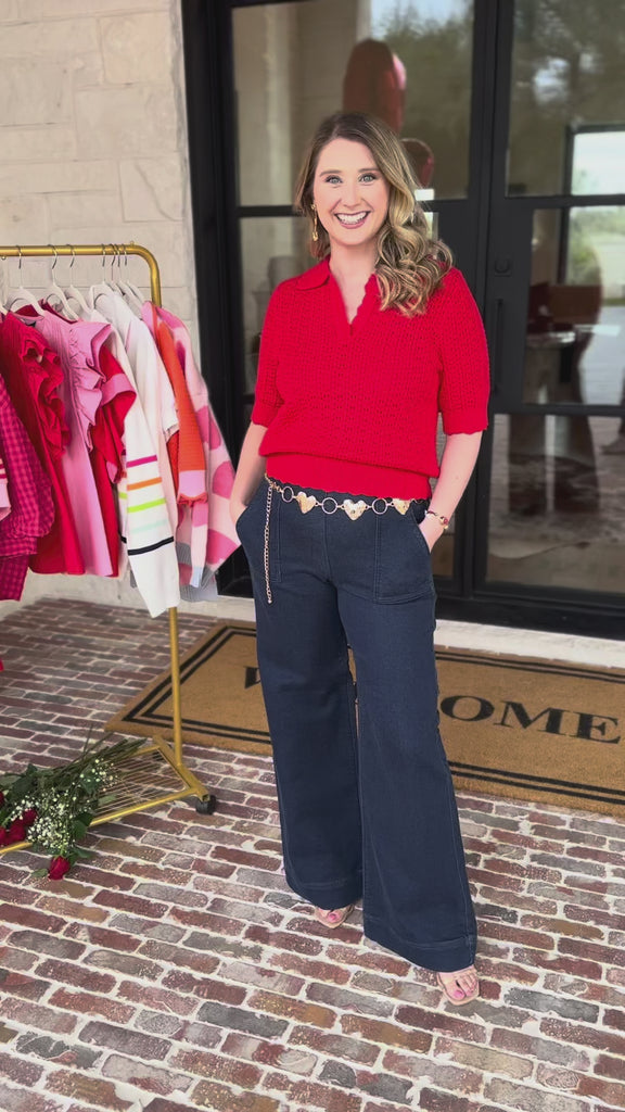 Introducing our new denim Risen Dark Wide Leg Patch Pocket Denim Pants! Chic and classy style with the comfort we all crave! Perfect denim to dress up for your next date night or wear casual with a pair of fashion sneaker!